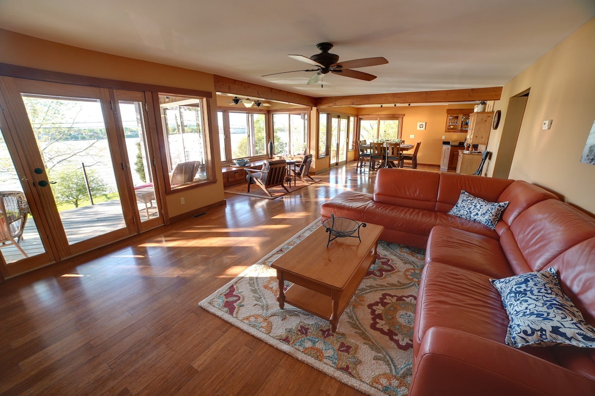 Great value kicking back watching the river go by. Water views are everywhere at your pet friendly 5-acre riverfront retreat. The private game room and walking trails are ideal to spread out for recreation. Foodies will be delighted with a well-appointed main kitchen and a second covered patio grilling kitchen. Remote workers have a comfortable desk with river views. Explore the many popular activities and attractions nearby, then catch a sunset on the deck or next to the riverbank bonfire.
