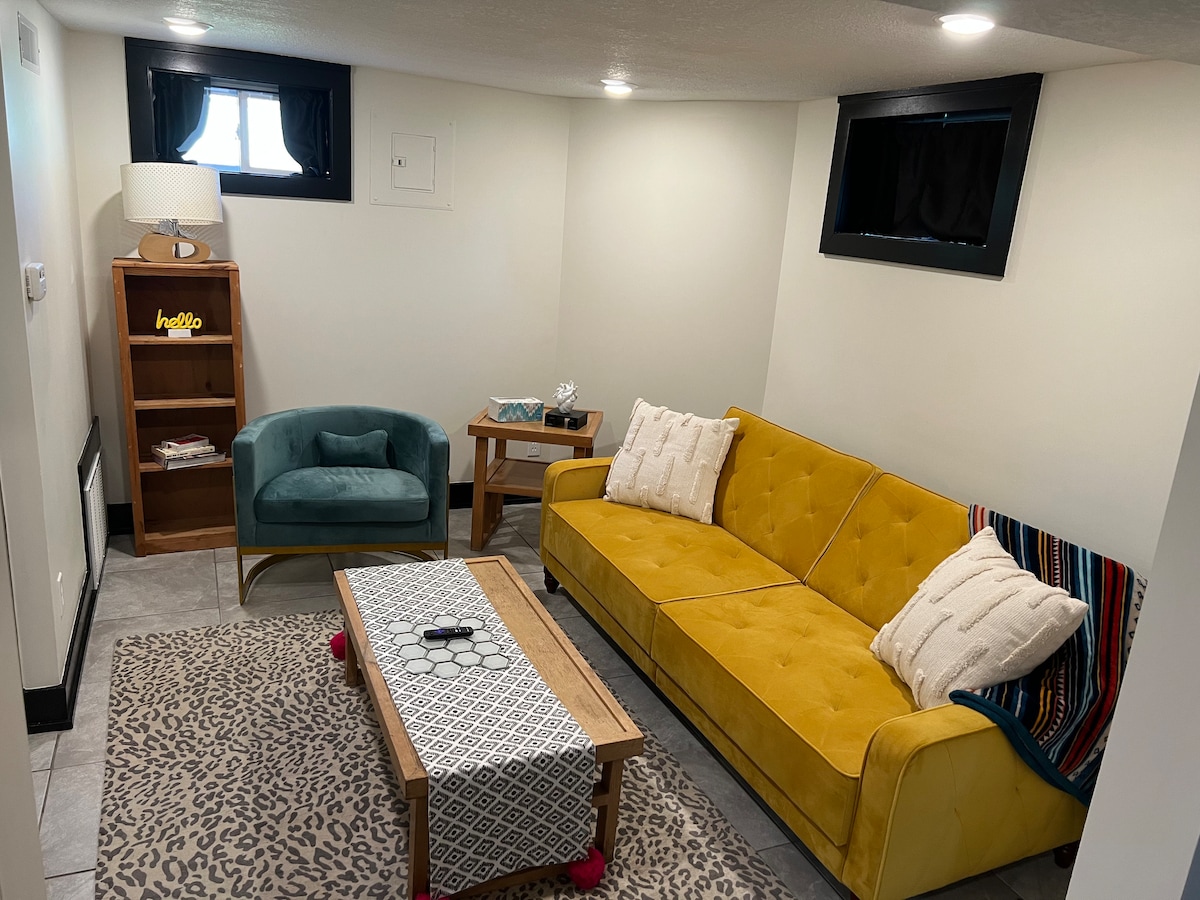 Entire lower level of home with 2 beautiful large bedrooms, spacious bathroom with lots of hot water in shower! Beautiful fireplace in gorgeous living area with dining area. Kitchenette includes refrigerator, toaster oven, microwave and Keurig coffee maker This lower level apartment is light and airy with large windows in each room! Bedrooms include televisions along with big screen TV in living area. Private outdoor sitting area with fire pit to enjoy your evenings!