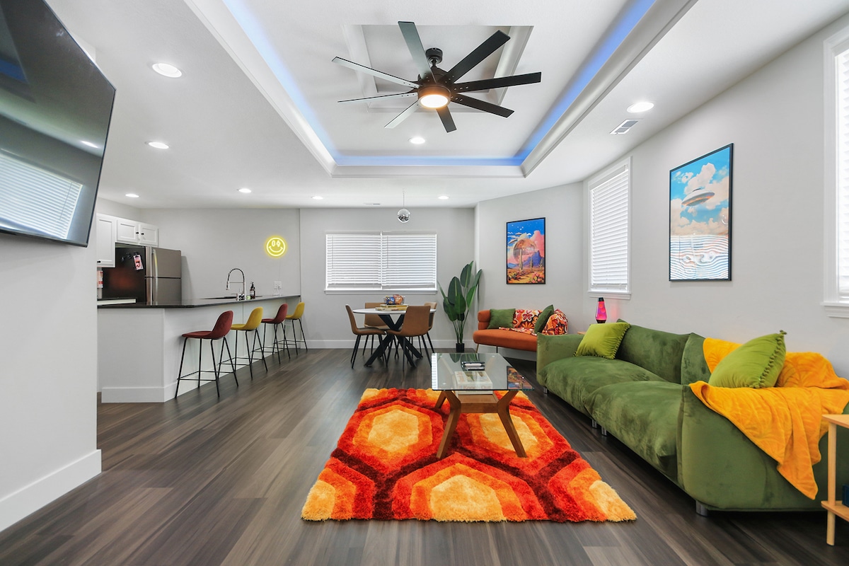 This stylish place to stay is perfect for group trips. Get down to the sounds of the 70s in modern comfort. Ideal for crews, families, or any soul looking to groove back in time. Come on and experience the jive of living in a former church turned cool 70s crash pad. The Groovy Getaway is your righteous retreat for making new memories and reliving the dynamite days of the past! Perfect for weekend getaways, Mizzou games, and long term stays!