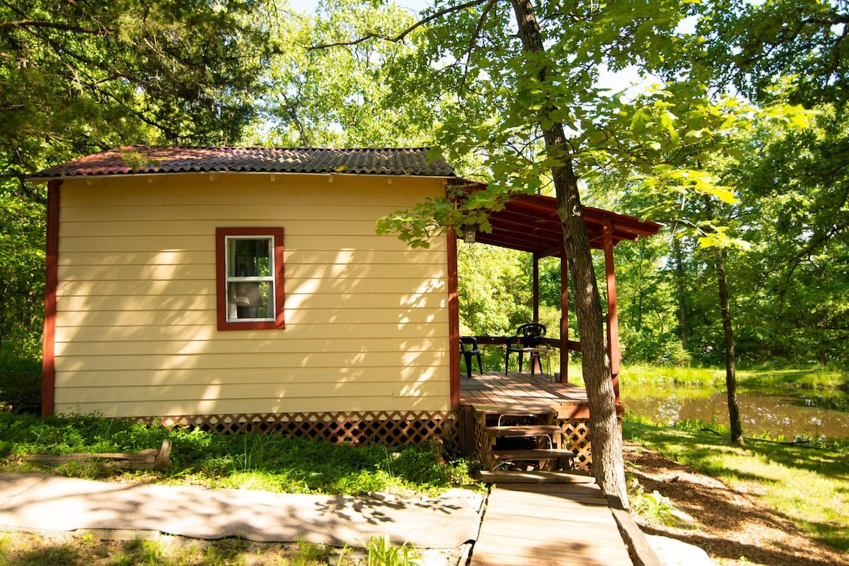 Sweet little cabin by a little pond at the edge of the woods. Large sunny windows, real bed, (with room to bed a child or two down on the floor) tea pot, easy chair, composting toilet, AC, WiFi, hiking trails. There's no shower in the Cabin. Our water is from a deep well, tested, certified ... and delicious! There is an above ground pool, trampoline, and a trail down the hill Very child friendly. We maintain a fragrance-free facility, so no air "fresheners".