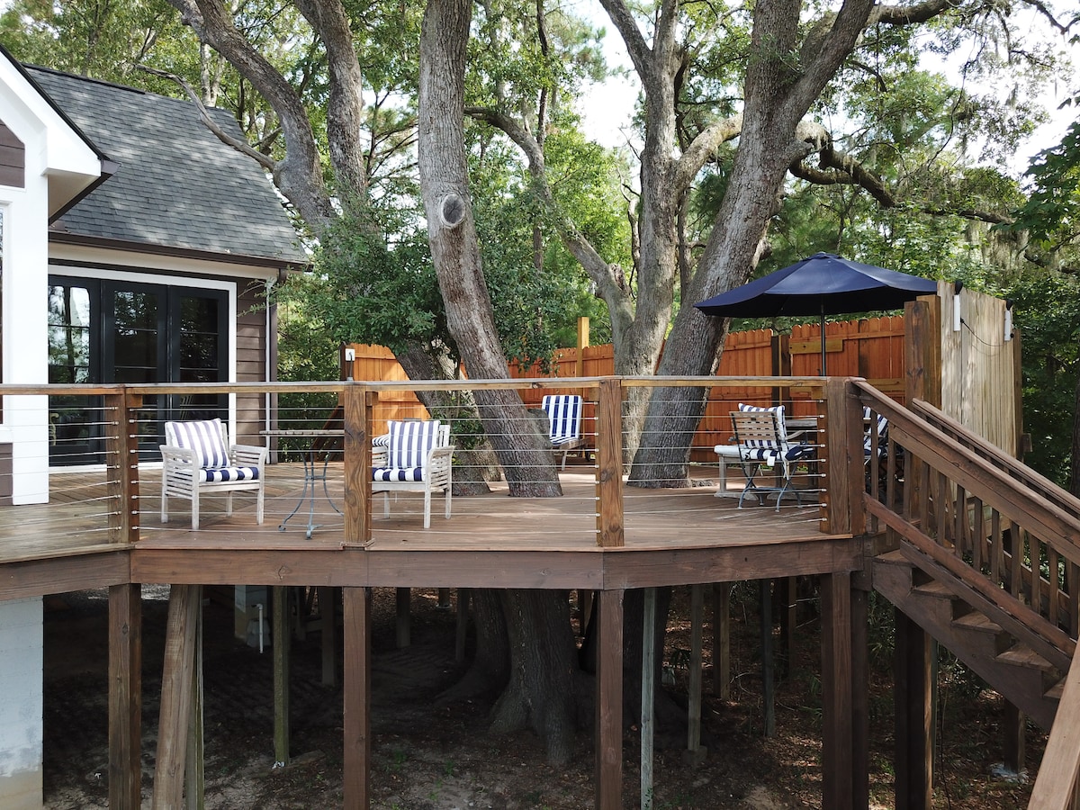 Marsh and creekside Luxury Treehouse nestled among historic Grand Oaks. Private Elevated TreeHouse that has closeup views of trees and wildlife from every oversized window. Sit back and relax on the large deck watching the ebb and flow of the tide as fish jump, birds hunt and fiddler crabs defend their bank. (This property has been granted an exemption and does not accept pets or Service animals due to allergies.)