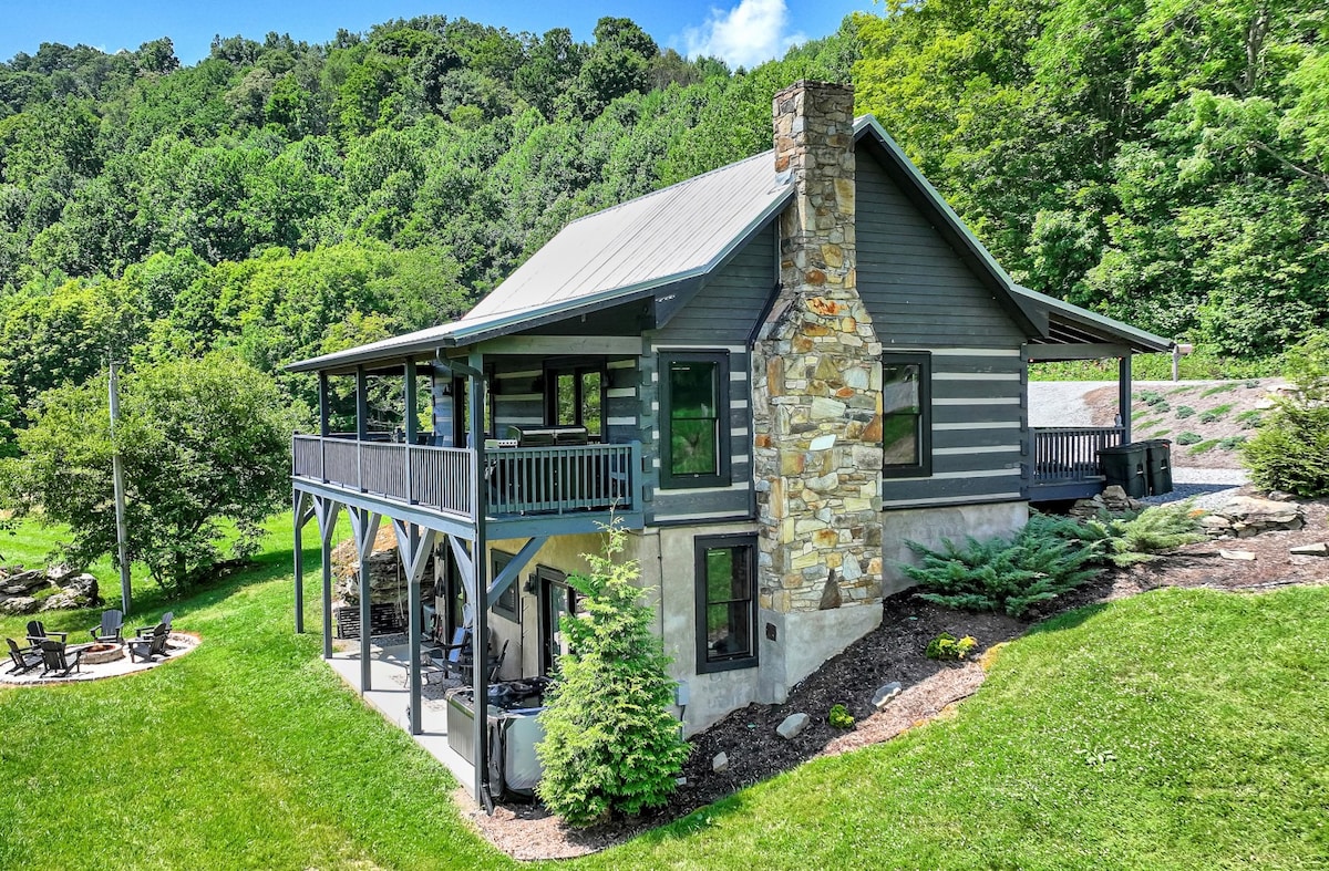 Greystone Cabin on Cove Creek is an all-new luxury mountain cabin featuring a babbling creek and 6 person hot tub with stunning views of the surrounding mountains! 15 min from the shops & dining of downtown Boone, this rustic-chic Cabin offers 5 star comfort and relaxation inside & out! Ski in the winter, fish 3 types of trout, tubing & soak in our creek, swing over the creek and relax by the fire pit. Enjoy all the peaceful bliss watching the cows and horses graze our “Mini Ireland” property!