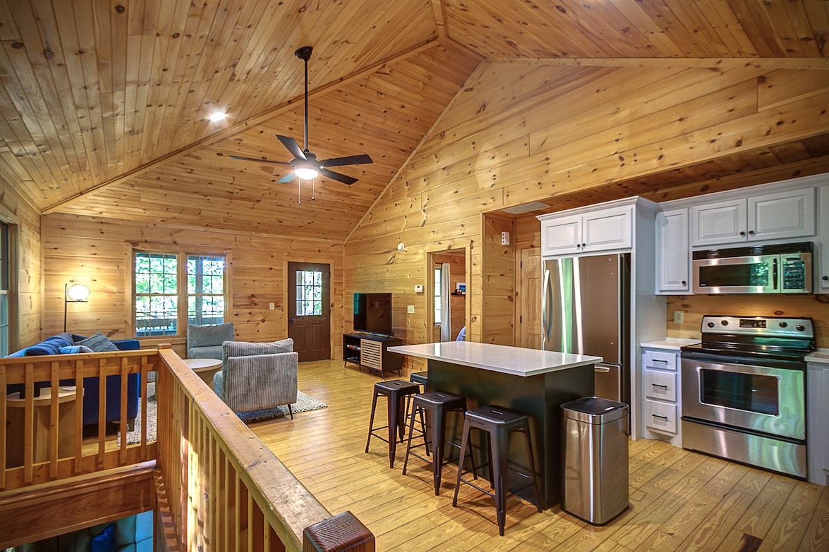 Tuscarora's a newly renovated 572 SQFT. Cottage with an open concept that offers A fully equipped Kitchen, Large Refrigerator, Stove, Dishwasher, Microwave. The Living Room features entertainment center with fireplace, tons of storage, Cocktail Service area, 50 Inch Smart TV, QueenSleeper Sofa with Memory Foam, And a closet with washer dryer. The Bedroom Has a queen size bed with Closets on each side of the bed. The bathroom Features a spa like feel with a rain shower, double sinks.