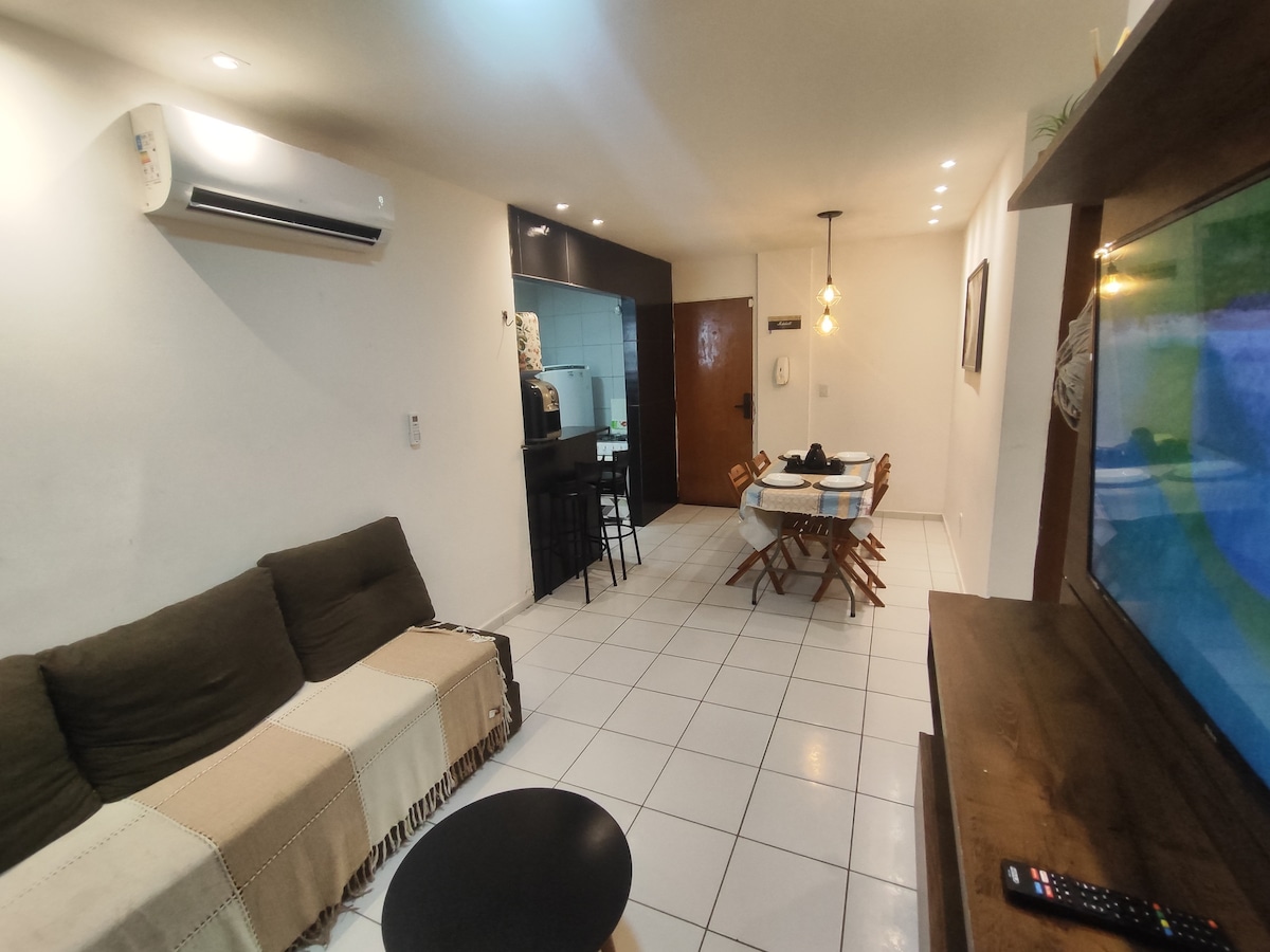 ATENÇÃO: Precisa descer 10 degraus sem acessibilidade. Comporta 7 pessoas, 2 em cada quarto, na sala 2 pessoas no sofa cama e 1 na rede. A 5 km do Parque do Povo (Centro). Simples e pequeno, porém completo, confortável, aconchegante e seguro. Parada de ônibus NA PORTA. -1 quarto com 1 cama de casal, tv, ar; -1 quarto com 1 cama de casal, ventilador; -1 banheiro social completo; -1 cozinha completa; -1 sala com Smartv, sofa cama e ar condicionado; -Garagem para 1 carro; -Porteiro 24hs;