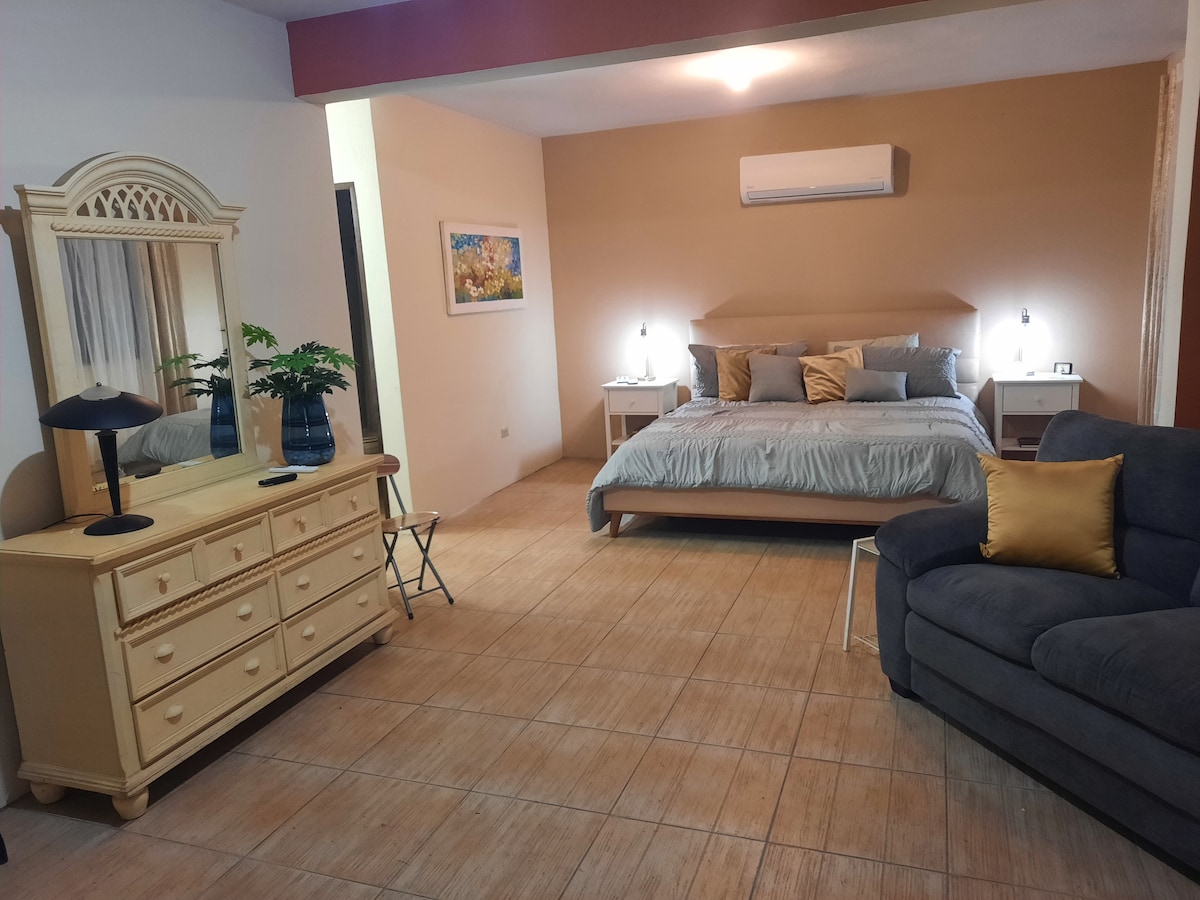 La casa se encuentra en perfectas condiciones. Equipada con abanicos de techo en todas las áreas. El comedor tiene una mesa colgante con 6 sillas. TV en la sala y todas las habitaciones. La sala cuenta con cómodo love seat, butaca y algunos juegos de mesa. La cocina está equipada con nevera, estufa, microondas, cafetera y utensilios básicos. Casa bien ventilada. Acondicionadores de aire en todas las habitaciones. Espacio de patio acondicionado con pérgola, mesas, sillas y bbq.