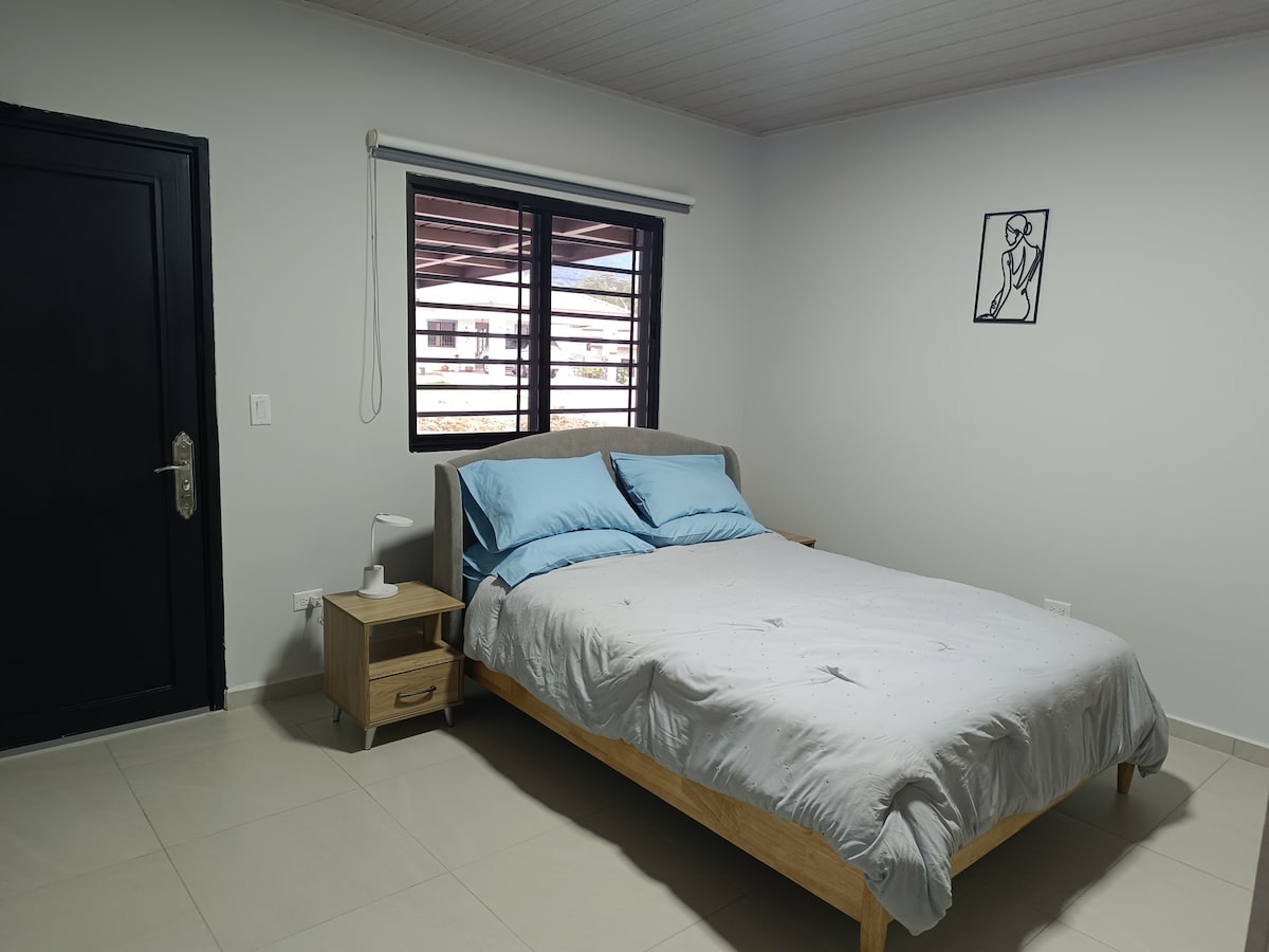 Elegante habitación que cuenta con estacionamiento bajo techo, entrada independiente, cama Queen size, almohadas, sabanas, mesitas de noche, área de trabajo, tomacorrientes, wifi Starlink, smart tv 50" (Netflix y Youtube), mini refrigerador, closet, gavetas, cortina blackout, abanico recargable, baño privado, agua caliente, toallas, jabón de cuerpo/manos, basureros y papel higiénico.
