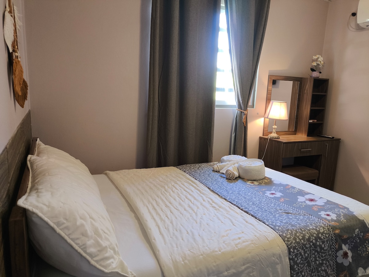 Luxurious one bedroom apartment with incredible view from above to town at CASA EJECUTIVA BOQUETE. A full kitchen, 1.5 bathrooms, 2 king sized beds, 1 queen bed and section to entertain guests. It has a full wrap around balcony and is extremely secure, with the only entrance being a single heavy oak door. Fast primary internet connection (~100mbps), backup internet connection, solar panels, and water tanks on site. We never lose water or power. No stairs for this apartment.