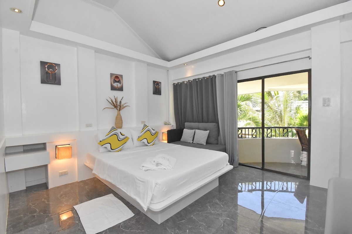 This is a DOT ACCREDITED beach front bedroom is tastefully furnished with local art and is equipped with conventional conveniences, such as an air-conditioner, hot and cold showers, and a flat-screen TV. The inviting queen bed is dressed in clean, white linen and has minimalist side tables on both sides. The flat features a balcony that offers excellent views of Bulabog Beach. Station 2 White Beach is less than 10 minutes walk only .