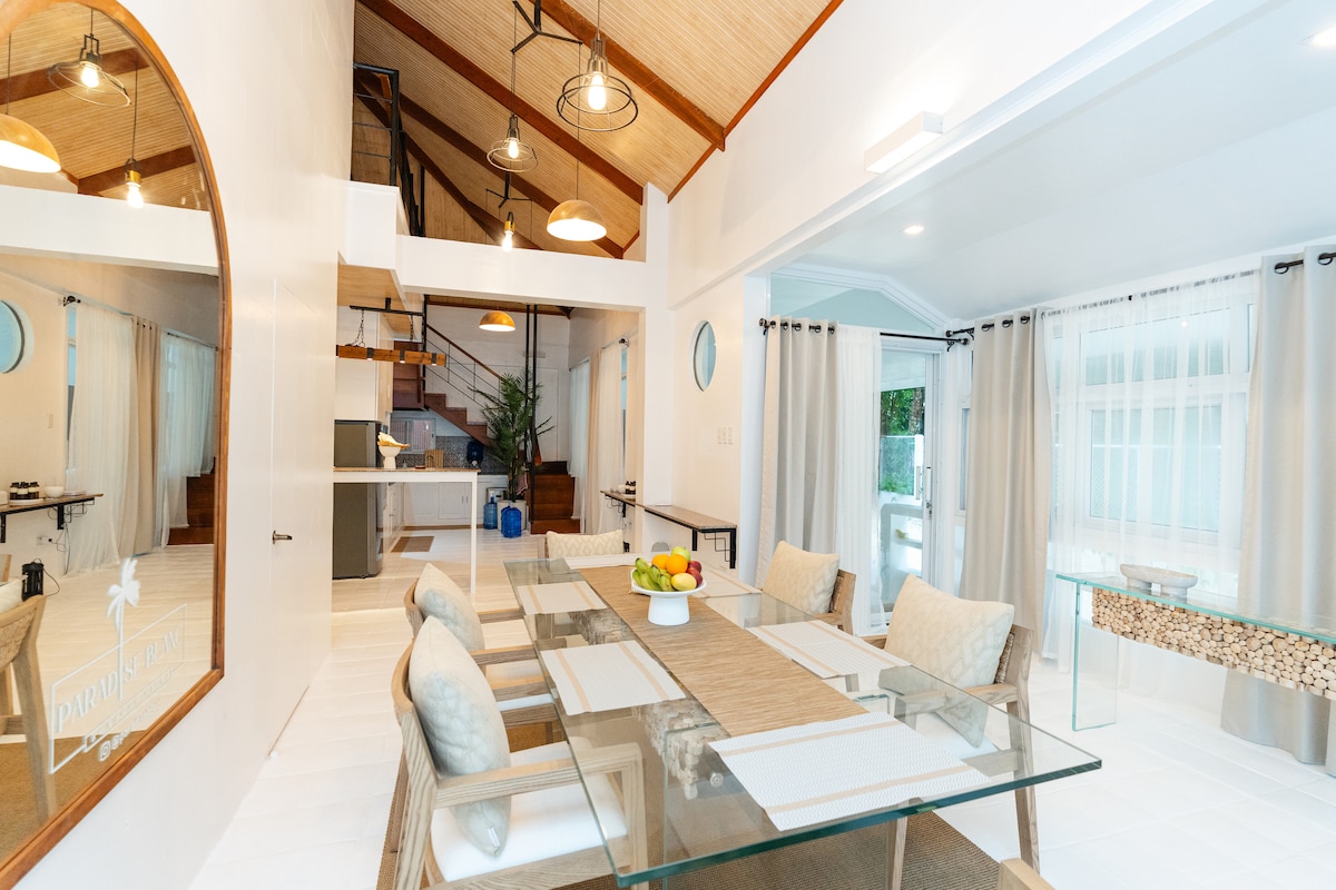 Welcome to Paradise Blanc—a Bali-inspired getaway in the heart of Boracay’s Station 1! Just steps from the beach & near top cafes and bars, this villa is perfect for families or friends. The property features two houses: the main house w/ 3 bedrooms, 3 baths, and a loft bedroom w/ its own bath, plus a fully equipped kitchen. The smaller house offers extra privacy with 1 bedroom, 1 bath & outdoor seating with direct pool views. Enjoy air-con rooms, fast WiFi & a private pool—see you in paradise