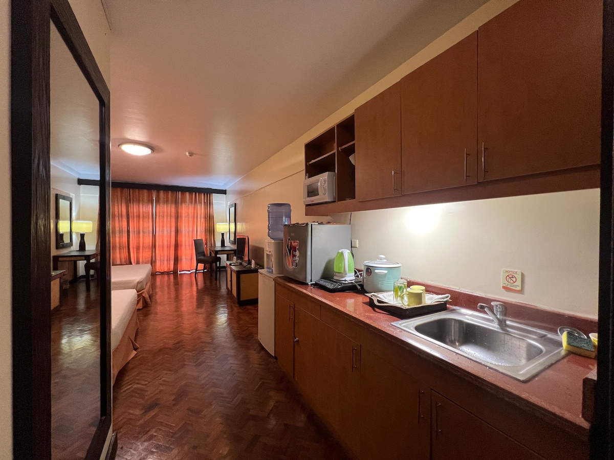 Kick back and relax in this calm, stylish studio apartment with a beautiful hill view. The space features two double-sized beds, comfortably accommodating up to four guests (depending on size). Enjoy the convenience of a basic kitchenette and unwind in the bathtub for a soothing end to your day. Note: Located on 2nd floor unit with stairs only no elevator on the building. The building is bit far from the lobby and main road going up and down is not suitable for senior citizen.