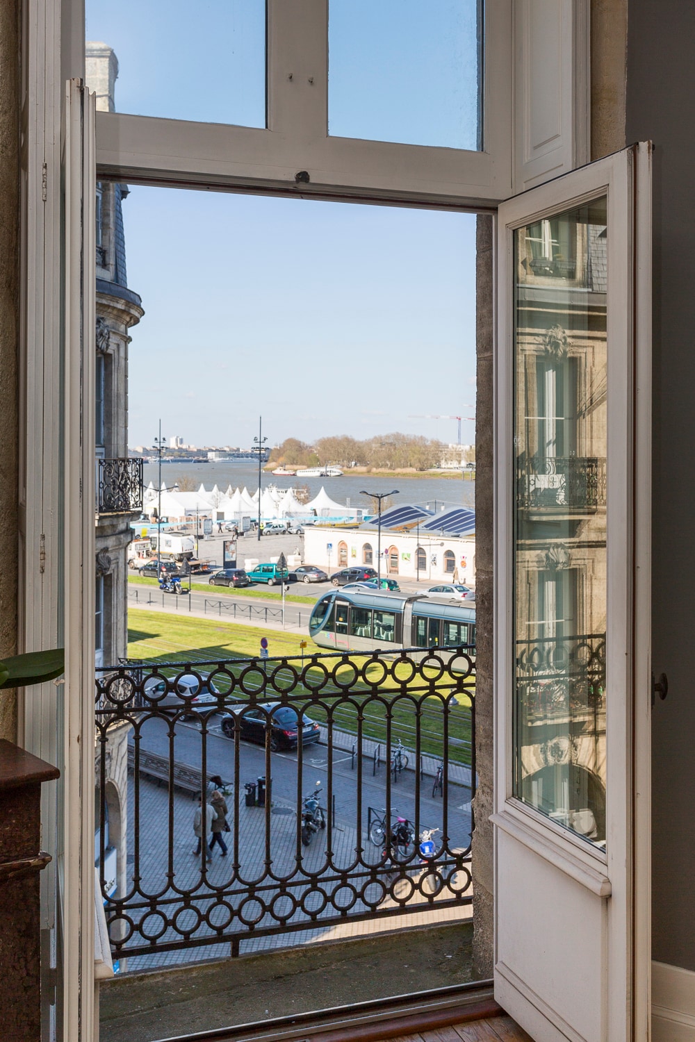 Charming flat typical of Bordeaux. This flat of 50 m2, located in Cours d'Albret, in a small bourgeois building is particularly comfortable, with an elegant decoration . Flat on a driving avenue for cars and buses. Windows are with double glazing. It is well equipped (wifi, Tv, queen size bed ....) and will allow you a comfortable stay. A few steps from the Palace of Justice, it is in the heart of the city center. Tram A and B , Bus G at : 50m. Supermarket, bakeries and restos nearby .