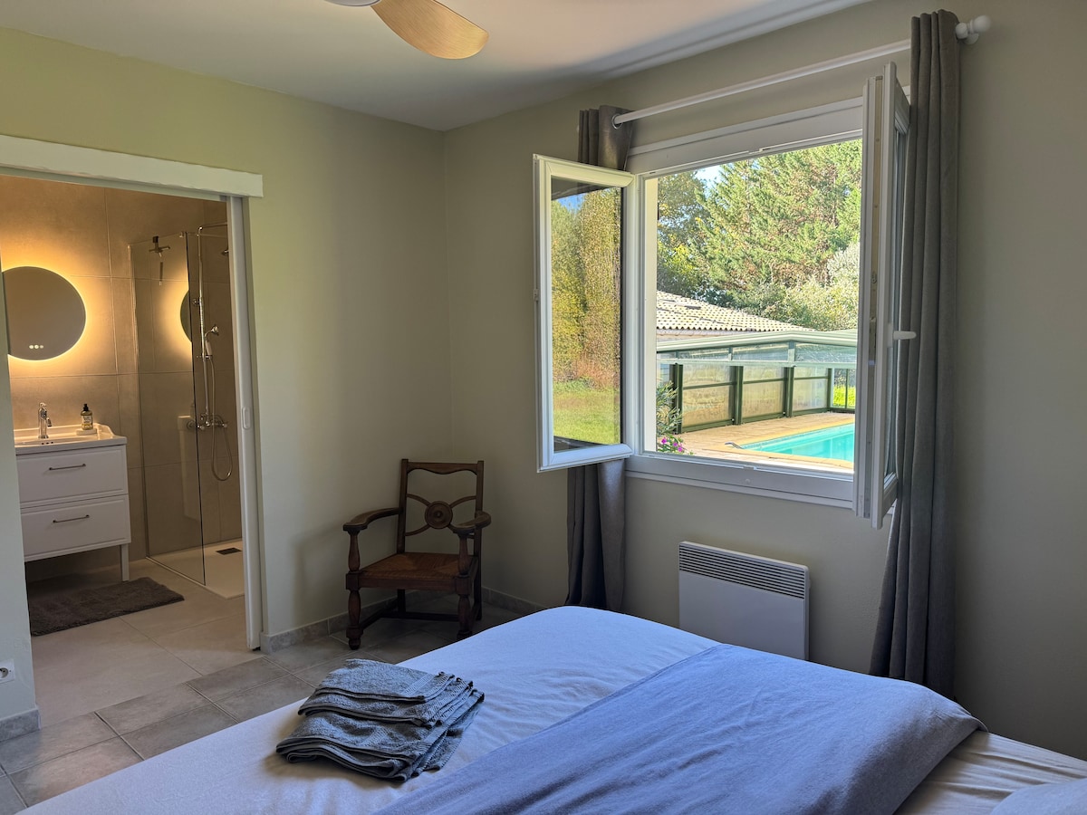 Grande chambre au calme et lumineuse, avec salle de bain wc et terrasse privée, indépendante de la maison. Nous fournissons les draps et serviettes de toilette, et de quoi préparer un petit déjeuner. Frigo, micro ondes, bouilloire, cafetière à disposition. Accès wifi.