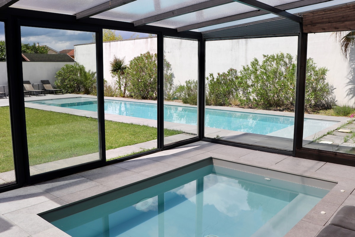 Détendez-vous dans cet élégant logement confortable et décoré avec goût. 2 terrasses couvertes pour prendre le repas où l'apéritif dans son superbe jardin au bord de la piscine sans vis à vis. D'une superficie de 120 m2 au RDC avec une chambre parentale de 21 m2 avec sa salle de bain attenante et wc. A l étage une 2eme chambre de 13m2 avec salle de bain et wc. Les enfants de -12 ans ne sont pas acceptés. Idéalement placé à 700 m de la ligne de tram direction gare et centre ville.