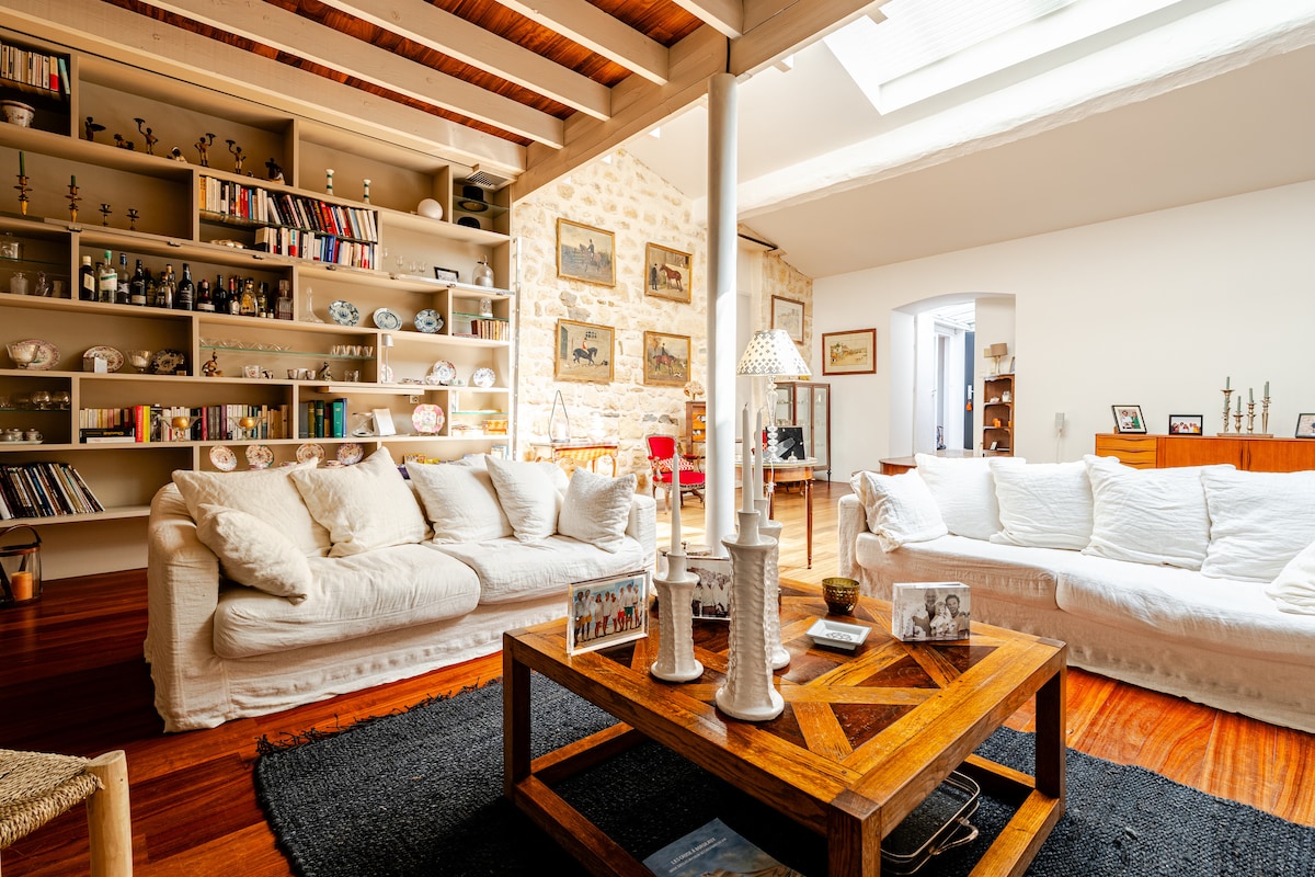 Apartment 165 m2 atypical with its magnificent old benefits (fireplaces/parquet/moldings), but also its loft side and original renovation. On 1 floor, very bright, nestled in a historic building of old Bordeaux, unique of its kind with its magnificent interior garden. Ideal location to walk in the whole center, charming area, many restaurants, close to the quays and the Capucin market. Perfect place to discover the city and its surroundings.