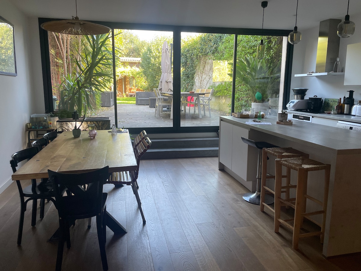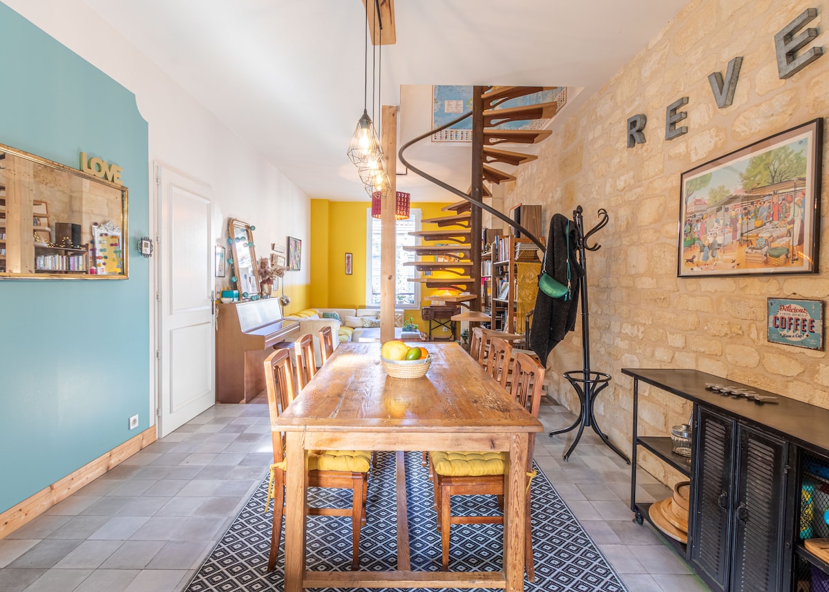 Our house is a former artist's studio completely renovted, typical neighborhood of Chartrons, in Bordeaux. The historic center is at three tram stations. You will appreciate our house for its atmosphere, away from the hustle and bustle of downtown but in a lively neighborhood. Our house is perfect for families (with children) and the pets are of course welcome! It has 4 bedrooms, 3 with double bed and one with a single bed. It is possible to install a second single bed on request.