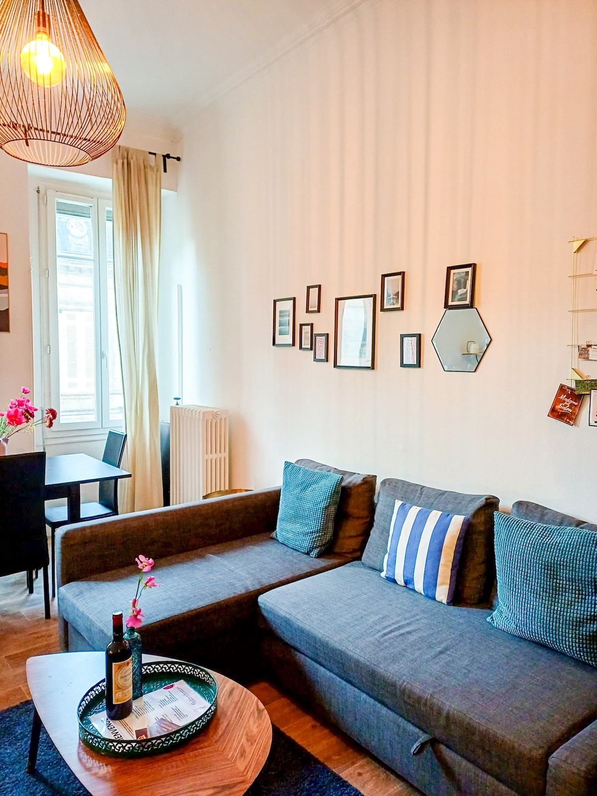 Spacieux et cosy, notre appartement de 70 m² vous accueille en plein cœur du quartier Capucins/Victoire à Bordeaux. Idéal pour 4 personnes (possible jusqu’à 6), il comprend 1 chambre, un salon convivial avec une alcôve comprenant deux lits superposés. Cuisine équipée, bureau, Wi-Fi, check-in autonome. À deux pas du tram, du marché des Capucins et de la rue Sainte-Catherine. Parfait pour séjour en famille, pro ou visite culturelle. Le logement est situé au-dessus d’un théâtre.