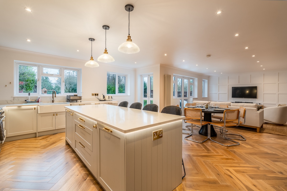 Stunning Riverside house with modern & spacious living. River Chess flows outside the king size bedroom with wonderful views of the countryside beyond. The property includes wet room, kitchen, huge sitting/dining room (double sofa bed) fibre broadband & beautiful conservatory with views to a second river. There is private access to the Chess Valley walk. Nearby Amersham, Chesham & Chalfont Underground take you to London in 30 mins. Harry Potter World is 15min away. Heathrow is 25 mins away