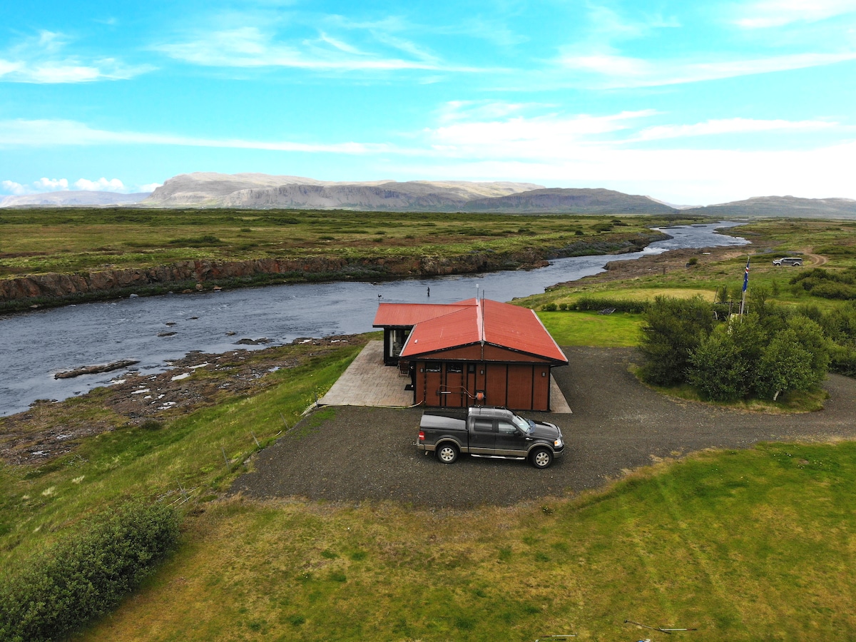Solvangur is a private fishing lodge built right next to the river Langá (e. long river), which is one of Icelands best salmon fishing rivers. You wake up and fall asleep the sound of running freshwater and jumping salmon. You can actually see the salmon jumping from the living room window. During the winter it is the perfect place to see the spectacular northern lights. It is a perfect getaway or base for your vacation where you experience the peacefulness of the Icelandic country side.