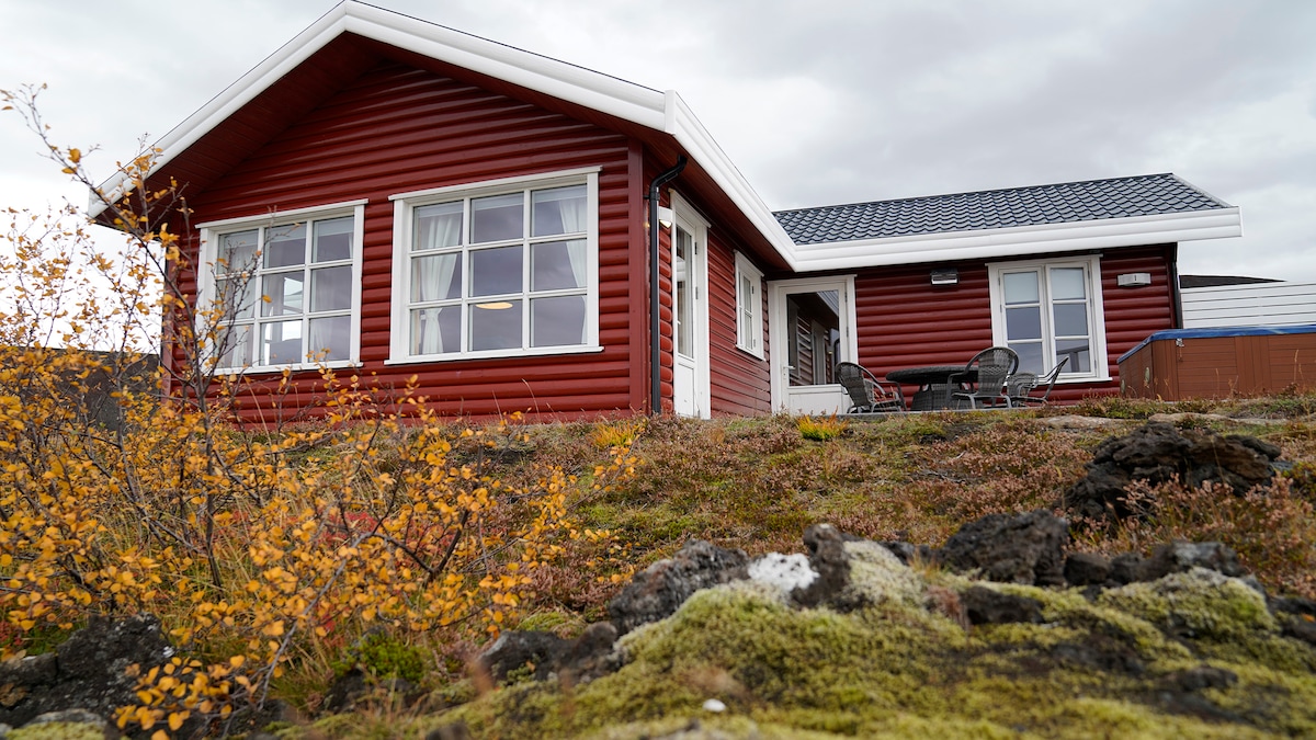Wooden, warm house for six people. Perfectly integrated into the lava field at the foot of the extinct GRABROK volcano, which you can enter almost straight from home :). Beautiful views and silence. Only the sounds of nature can be heard. An ideal place to observe the northern lights (no city lights). Just 300 meters from the main road No. 1. Fully equipped kitchen. Perfectly clean drinking water flows from the tap. The jacuzzi is already working :) There are bubbles and it's nice :) !!!