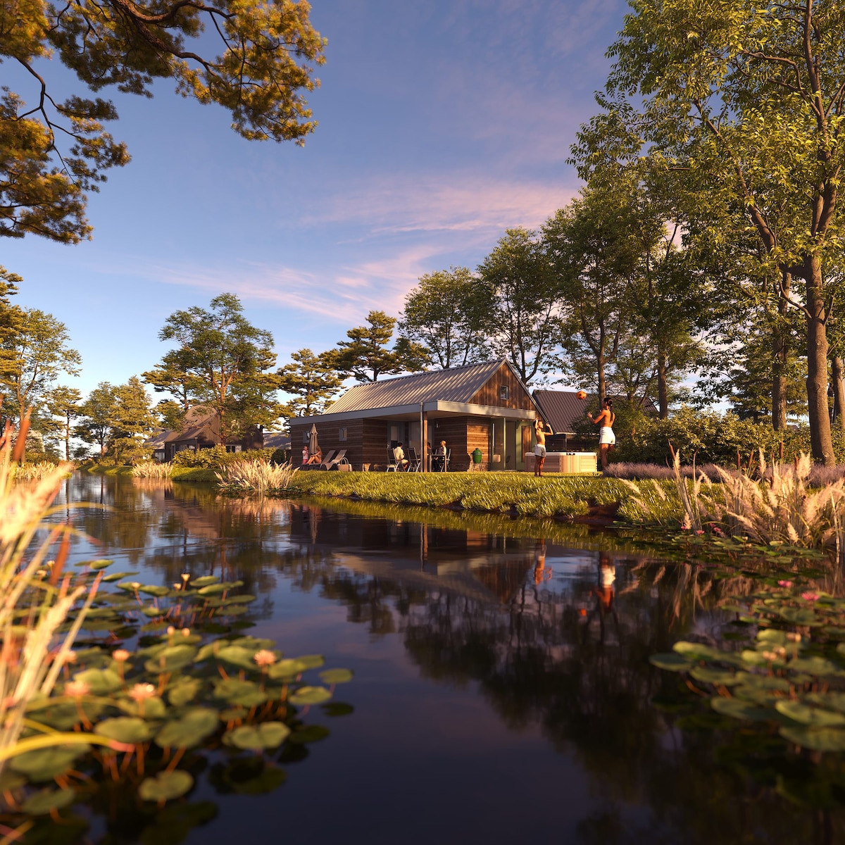 豪华度假屋,配备热水浴缸,毗邻水域和森林。
