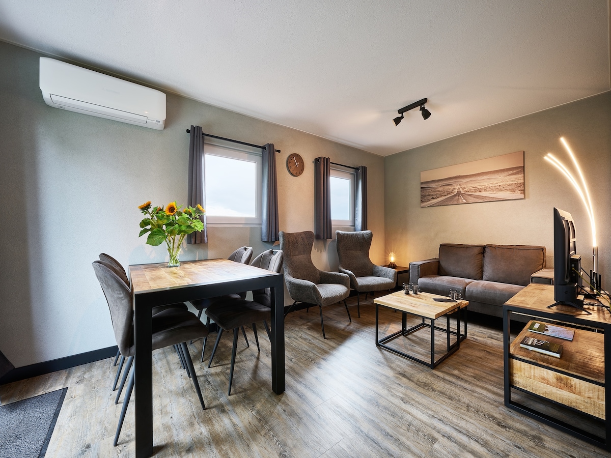 Deze luxe accommodatie (voorste deel van de totale accommodatie), met houtgestookte hot tub, is perfect geschikt voor gezinnen, families en groepen van tot 12 personen. De inrichting is stijlvol en luxe met chesterfield bankstellen, grote eettafel en keuken met vaatwasser, koelkast (2), en alle benodigdheden.