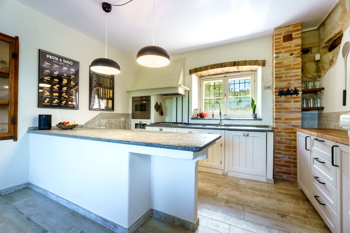 Situata in un grazioso contesto collinare la casa è composta da un'ampia zona living con cucina integrata ed una camera da letto con caminetto, entrambe con accesso alla terrazza, due bagni, terrazza esterna e cortili da ambo i lati. Presente inoltre locale con sauna e ellittica. Possibilità di parcheggio interno. Da sempre appassionati di animali, abbiamo con noi cani, gatti, cavalli e asini che vi accoglieranno. Per questo motivo si richiede la pre approvazione per feste o altri eventi.