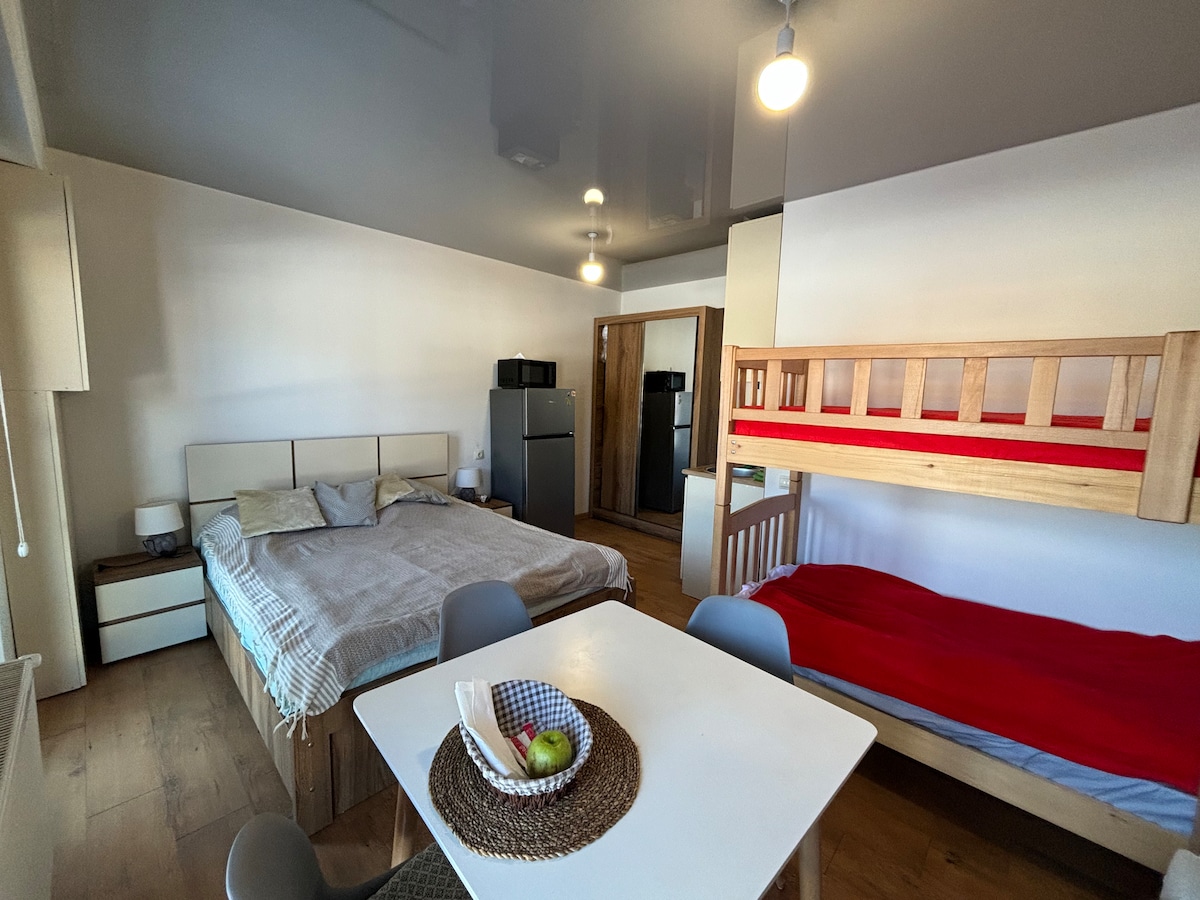 Leave your worries behind and enjoy the peaceful atmosphere of this unique accommodation. The studio is bright and cozy, with a window-door opening onto the inner courtyard. It features a double bed and a bunk bed, comfortably accommodating up to 4 guests.