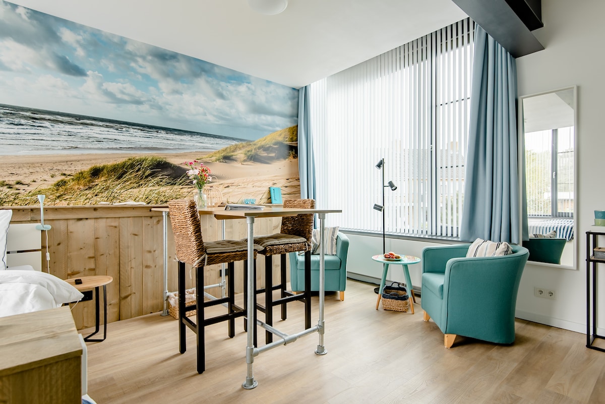 Zoek je meer ruimte dan de gemiddelde hotelkamer? Dan is deze plek voor jou geschikt! Onze zithoek ademt sfeer om te loungen, aan het raam een tafeltje voor 2 . In de gezellige kitchenette vind je alles om zelf iets op te warmen in de oven en koffie of thee te zetten of een koel drankje te pakken uit de koelkast. Natuurlijke materialen, persoonlijke accenten en aandacht voor hergebruik voelt deze plek als een tweede thuis.. Een ruime instapdouche/toilet en comfortabel bed maken het compleet