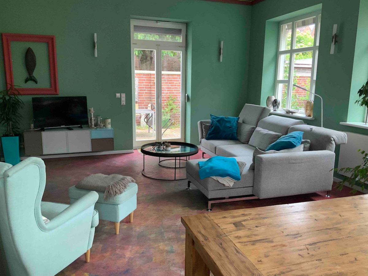 Meine Wohnung befindet sich in einem historischen Gebäude, das einst die alte Rathausdruckerei beherbergte. Sie bietet 130 m² mit hohen Decken, großem, offenen Wohnbereich mit Zugang zum Garten/Terasse und luxuriöser Küche - alles im Erdgeschoss. Ein eigener PKW- Einstellplatz ist dirkekt bei der Wohnung und auch bequem über die Terasse zu erreichen. Alle Einnahmen über airbnb werden übrigens ausschließlich genutzt, um die Wohnung NOCH mehr aufzuwerten! Genießt eure Auszeit - ruhig und zentral!