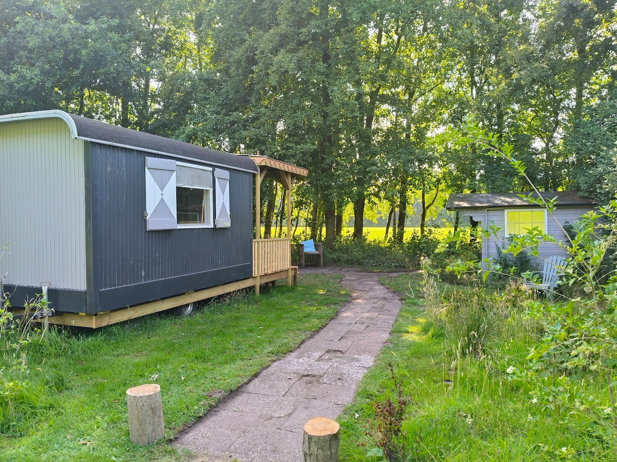 Het kleine huisje staat bij ons achter op het veld met een weids uitzicht. Parkeren kan bij ons voor op het erf, bij ons ander gastenverblijf. Via een stenen paadje kom je bij de stacaravan. Als het wat kouder wordt, kun je de houtkachel aansteken en je heerlijk opwarmen bij het vuur. Er is een ingerichte keuken met een twee pits gasstel. Alles is daar basic, dus geen luxe dingen. Het toilet is een droogtoilet, en er is geen douche aanwezig. Wel een wastafel met warm en koud water.