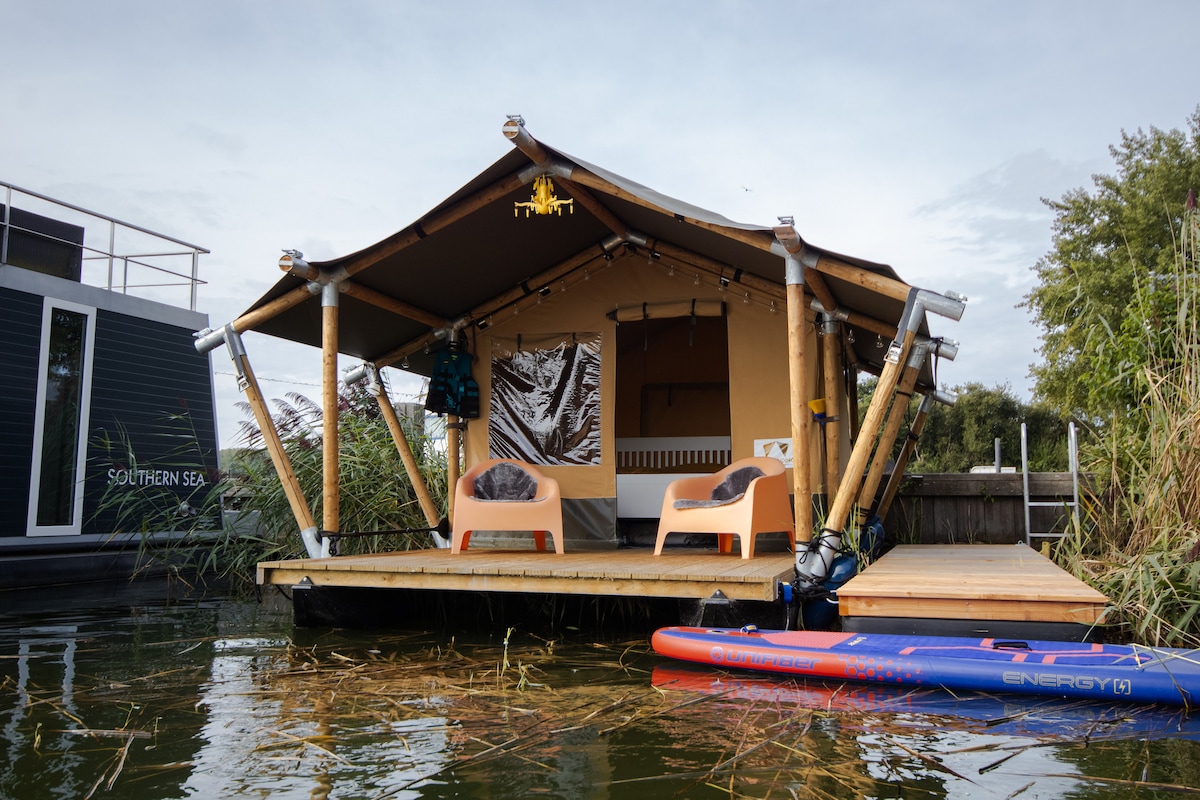 Op een prachtig plekje, drijvend op een vlot aan de kade van Camperplaats Veluwemeer, staat deze luxe Safaritent - geschikt voor max. 2 personen. De tent is voorzien van een fijn 2-persoons bed, ruime kast met inventaris (pannenset, kookgerei, bestek enz), compact koelkastje, waterkoker en koffiemachine. Op het terrein zijn eenvoudige sanitaire voorzieningen aanwezig. Er zijn mogelijkheden voor sup- en bootverhuur en tegen meerprijs is een leuke hottub & sauna te reserveren.