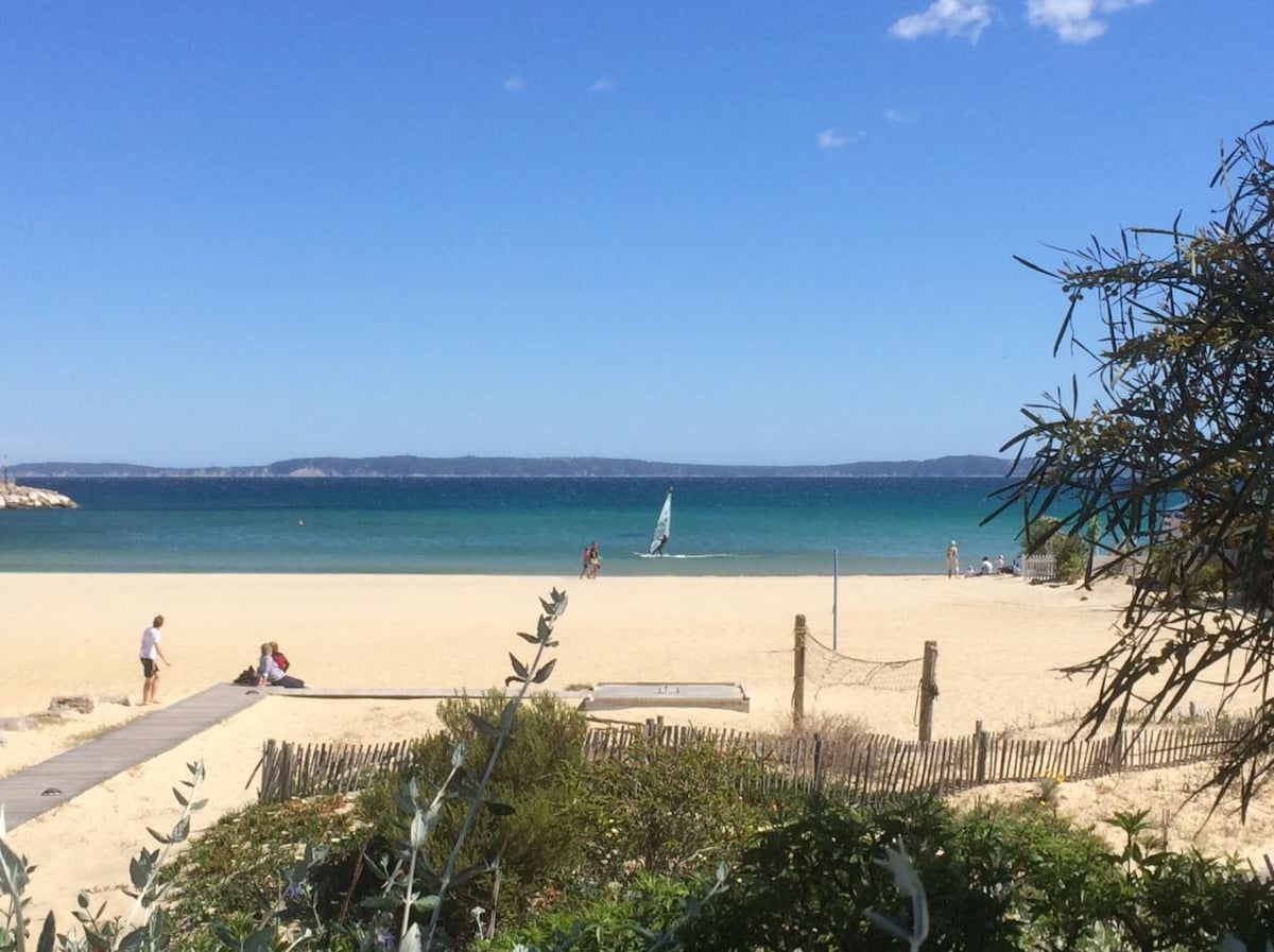 Appartement refait à neuf sur la magnifique et longue plage de la Bergerie Face à la mer, pieds dans l'eau directement sur la plage, Sabine et Sébastien vous accueillent dans leur magnifique cocon contemporain. Véritable havre de paix pour amoureux de la mer, vous ne la quitterez pas des yeux et pourrez profitez du lever de soleil sur les îles d'Or de votre lit. Ambiance cosy et chaleureuse, l'appartement et sa terrasse de 27 m2 sont à l’extrémité de la résidence pour plus d’intimité.