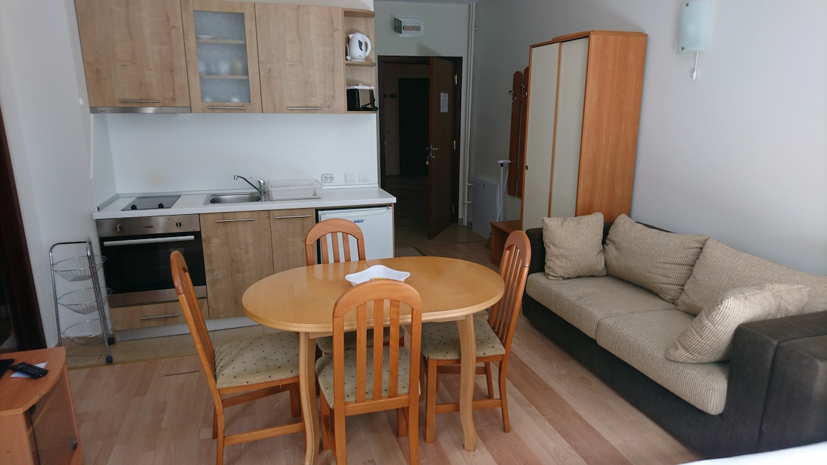 Spacious studio with fully equipped kitchen, a double comfortable bed and large sofa bed, wardrobe, commode and dinning table, comfortable chairs, TV and all you need for rest or home office in the mountain. The studio has its own large bathroom, as well as a seating area, and a terrace. Apt. B53 is located in the Borovets Gardens complex, a 7-minute walk from the gondola station. The building has a security and free guests parking.