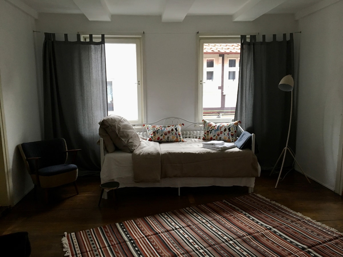 Die Wohnung befindet sich im OG, das über ein breite Treppe zu erreichen ist. Von der Wohnung aus gibt es einen schönen Blick auf einen Park. In der Wohnung sind zwei 140er Doppelbetten, wobei eines davon ein Hochbett ist. Von daher können z.B. unten zwei Erwachsene schlafen und oben 2 Kinder von 2 bis 12 Jahren. Da die Airbnb-Webseite leider noch nicht die Funktion hat, die Anzahl der Kinder anzugeben, bitte uns kontaktieren, sofern Sie eine Familie sind, um eine gemeinsame Lösung zu finden.