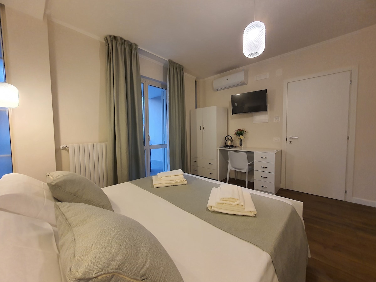 Il letto matrimoniale è posizionato di fronte ad un delizioso balconcino alla francese che affaccia sul Corso principale della città e, dal quale, si vede il mare. Il bagno, all'interno della stanza è dotato di doccia. The double bed is positioned in front of a lovely French balcony overlooking the main street of the city and, from which, you can see the sea. The bathroom, inside the room is equipped with a shower.