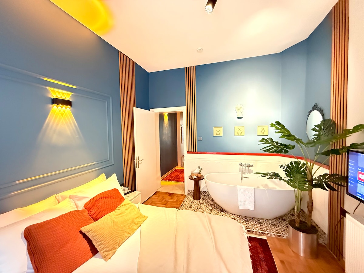The apartment welcomes you with it's relaxing interior and spectacular Historical Peninsula view. This amazing sight becomes even more magical from the balcony every season and every hour of the day.All the furnitures are chosen from exclusive design brands and aiming to make you feel comfortable in a luxury zone. The turquoise tiles are handmade gives the personality to this magical living space. The walls has a beautiful harmony with again beautiful custom made floor tiles.