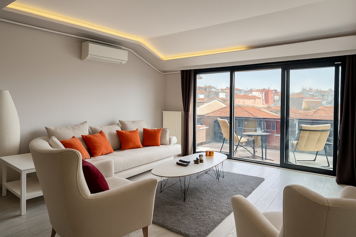 This extraordinary, stylish, spotless suite has a comfy sofa for rest, a high-quality bathroom, and an elevator in the great location in the Beyoğlu/Taksim district. Moreover, enjoy the magnificent panoramic view of Bosphorus (till Prince' Islands and Asian side) and Historical Peninsula (Topkapi Palace, Hagia Sophia, Süleymaniye Mosque, Galata Tower, along with other famous monuments) from its large private terrace with a big table.
