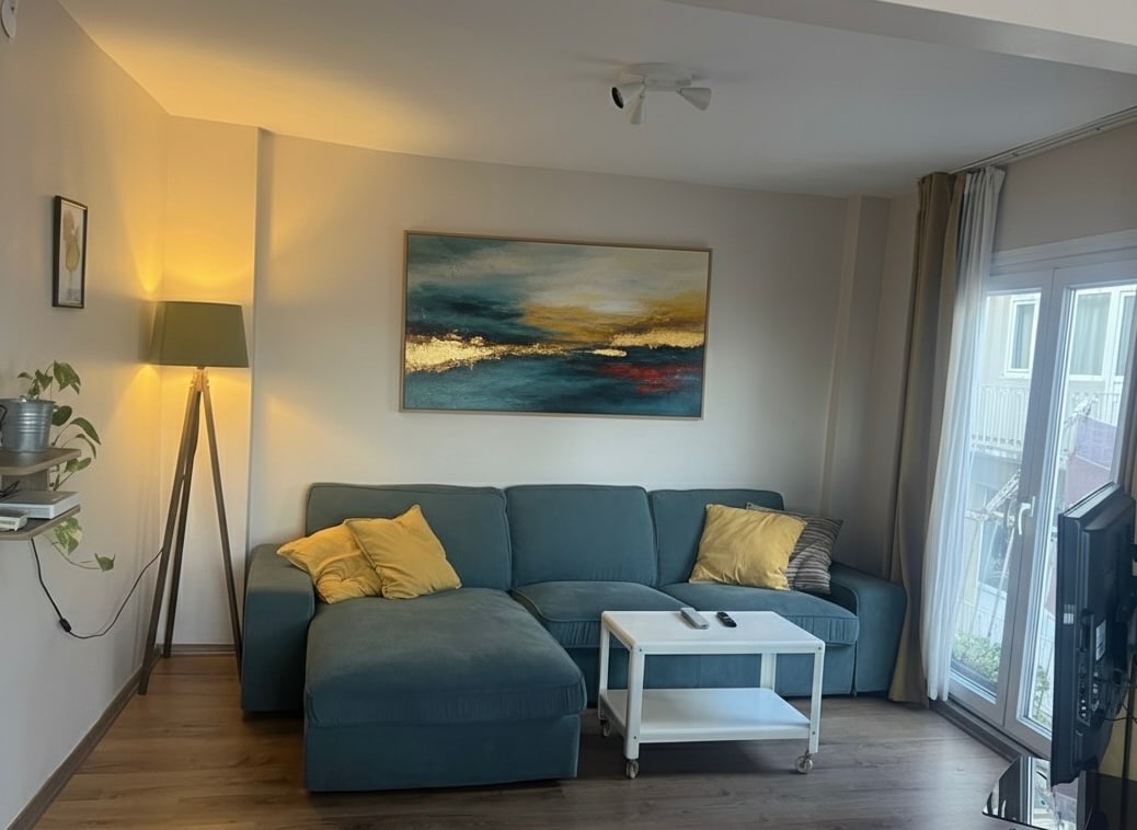 The apartment welcomes you with it's relaxing interior and spectacular Historical Peninsula view. This amazing sight becomes even more magical from the balcony every season and every hour of the day.All the furnitures are chosen from exclusive design brands and aiming to make you feel comfortable in a luxury zone. The turquoise tiles are handmade gives the personality to this magical living space. The walls has a beautiful harmony with again beautiful custom made floor tiles.