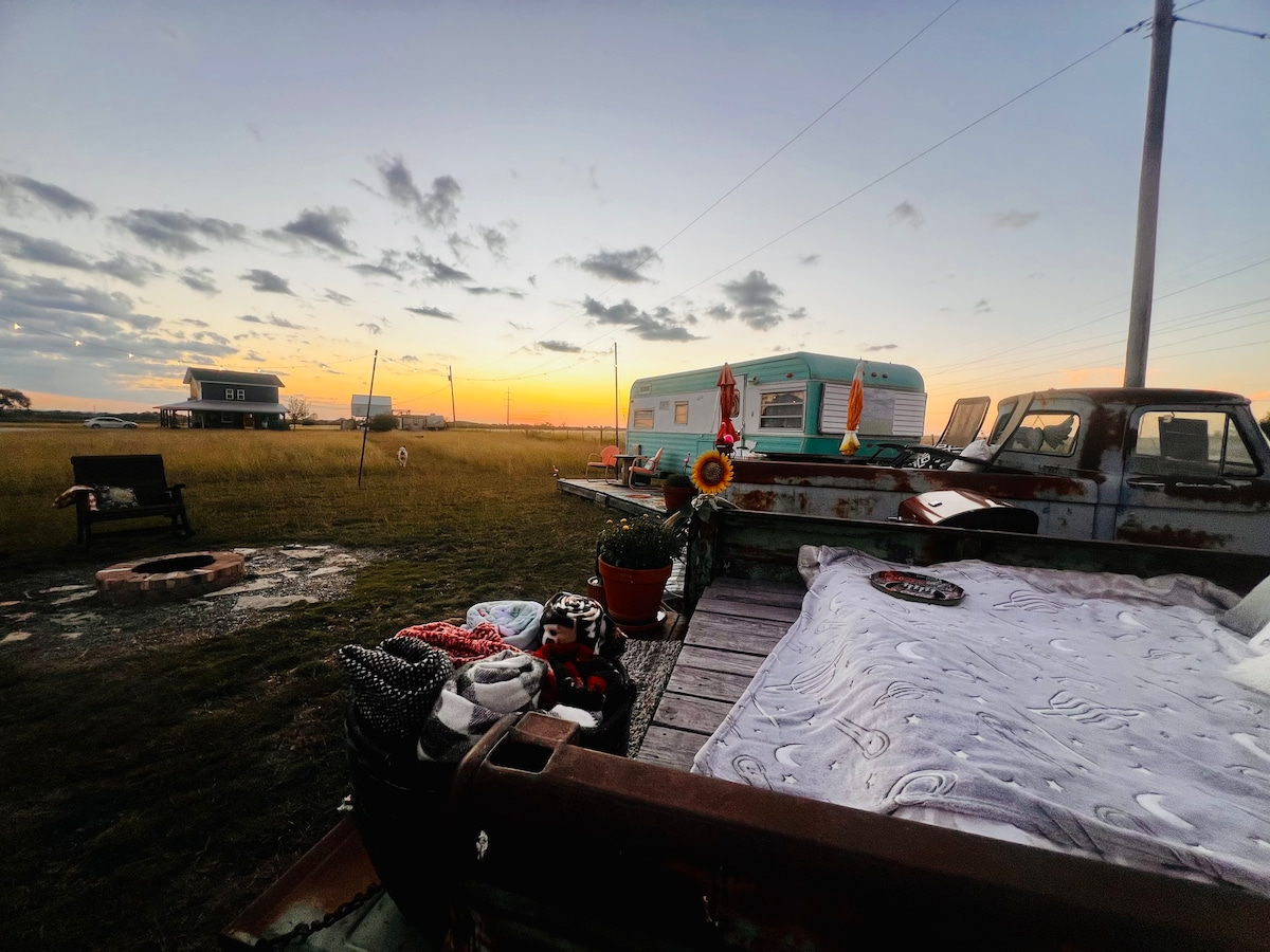 Meet Willie Cleo, our 1975 Holiday Rambler! She's been completely rebuilt, but still maintains so much charm and personality! She's perfect for a country getaway for those who love camping, but want a soft place to bed down with a few charming creature comforts like drip coffee, a mini-fridge, and a clean, comfortable bed! Arguably the best amenity is her stargazer truck bed and fire pit! Perfect way to watch sunsets and look at the stars!