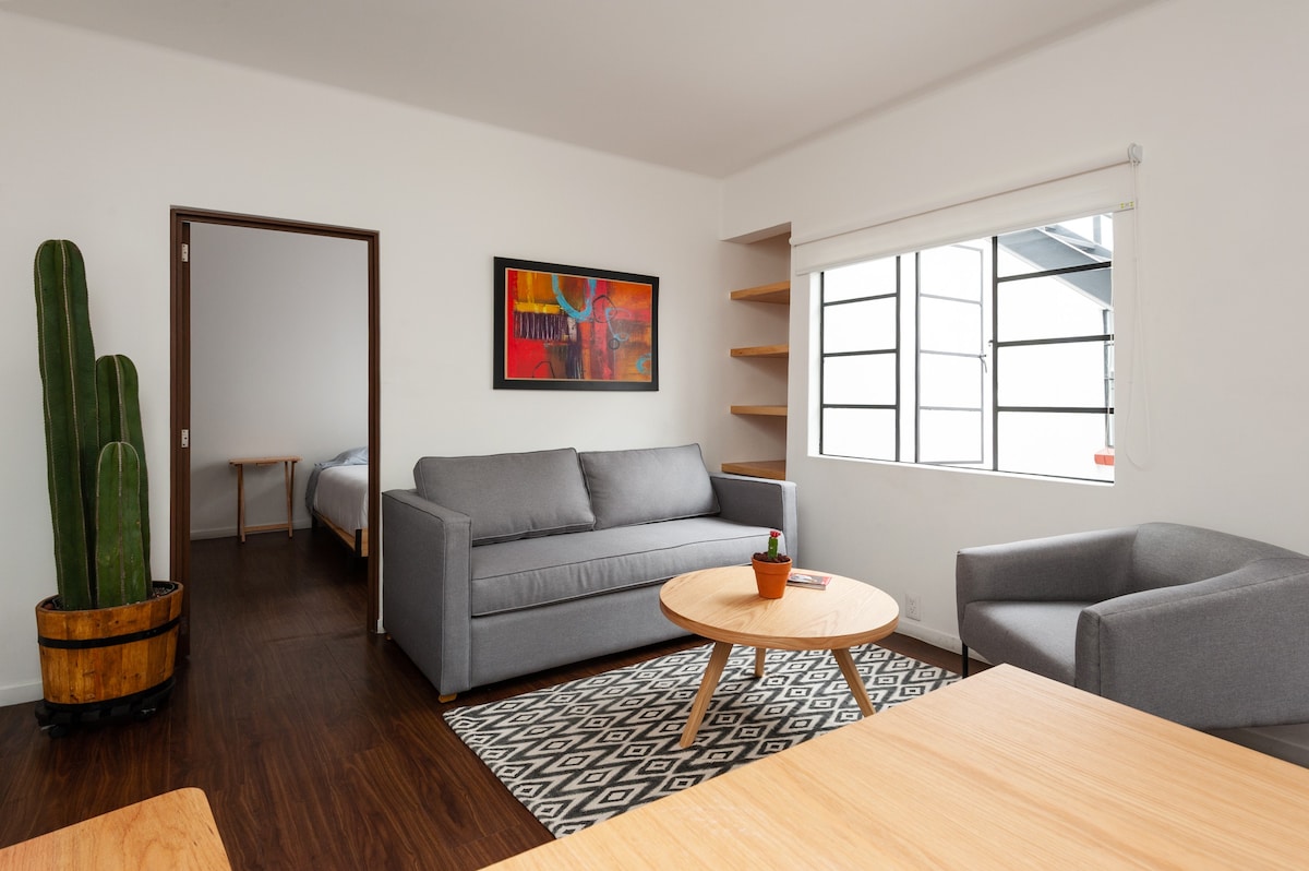 Cozy apartment on the 3rd floor. Minimalistic and beautiful view. Located in the best neighborhood called Condesa. The most trendy one in the city. Close to bars, restaurants and museums. Two blocks away from the metro station. 24/7 security building. .