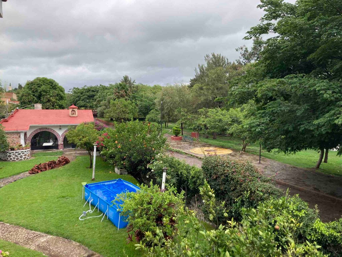 Casa tipo Hacienda Con chimenea, un área de jardín muy amplio, donde sentiras La Paz de de la naturaleza, y podrás disfrutar de tardes con tus hijos y mascotas o carne asada con amigos. y los niños pueden jugar y correr También contamos con alberca de 5 x4 y camastros WiFi, balcón con hamaca para disfrutar la vista Ideal para desconectarte de la ciudad. si estás cansado o estresado es el lugar indicado Estamos cerca de la barranca y zoológico de Guadalajara