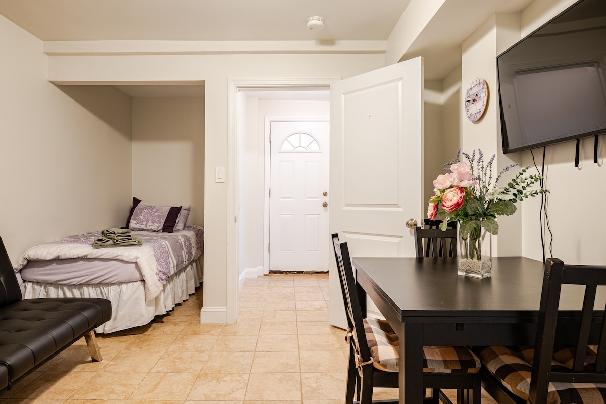 Priced for solo travelers but perfect for 2! Cozy studio, private entrance. Fully furnished w/queen sized bed (memory foam mattress), dresser, a/c, washer/dryer, bathroom with shower stall, closet, high speed Wi-Fi, kitchenette with a small fridge/freezer, griddle, sink, microwave, kettle, toaster, and rice cooker. On-street parking throughout the year on our quiet one-way street, driveway in the winter. Please note that the ceilings are 7 ft tall and shorter in some areas. Cameras outside.