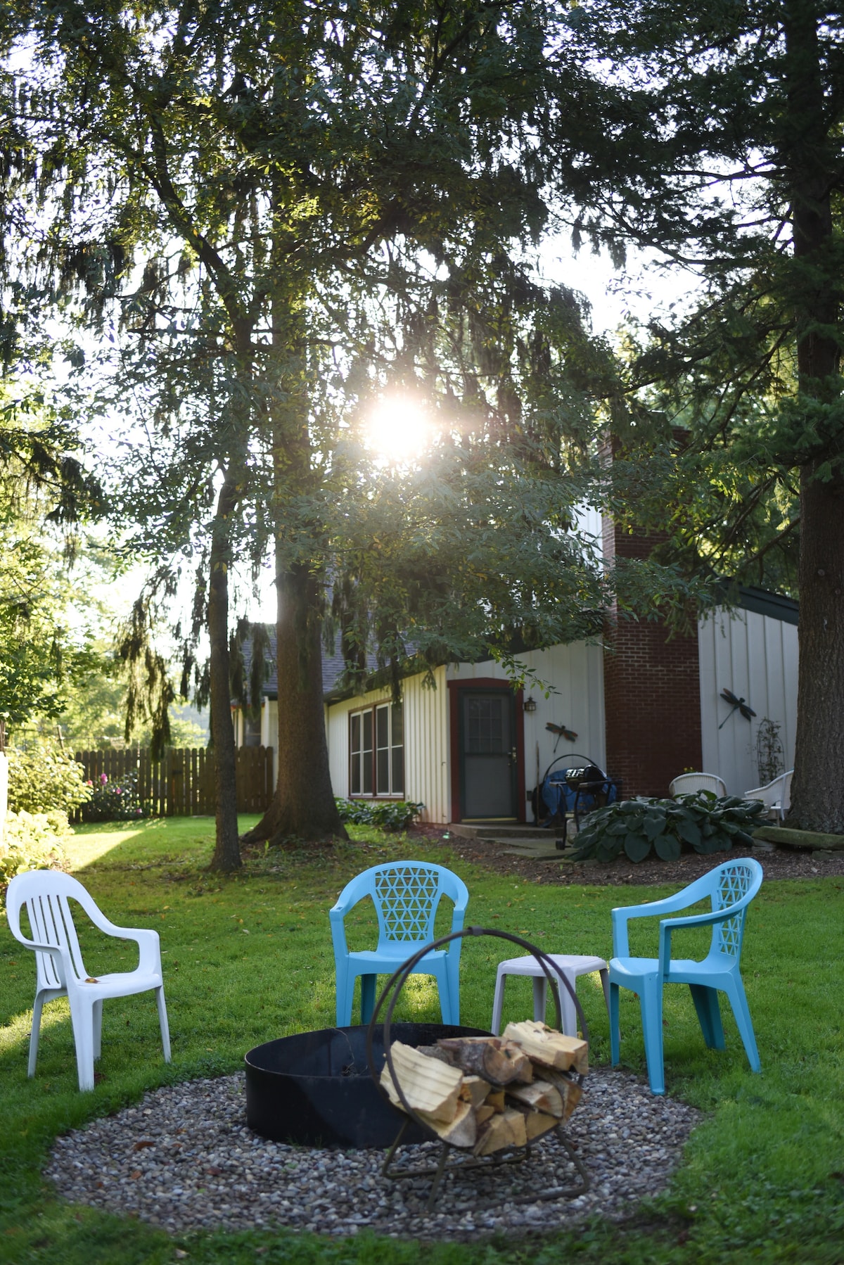 The Garden Apartment (PSTR Permit #2025-20) is a quiet and relaxing home away from home to enjoy after exploring the Cuyahoga Valley National Park. The Garden Apartment features a large bedroom with queen-sized bed, a den with a large sandstone wood-burning fireplace, full kitchen and bathroom with a shower. You'll surely fall in love with this cozy rental! There is a sandstone patio, which offers a shaded sitting area and grill for outdoor cooking, plus a fire ring for evening bonfires.