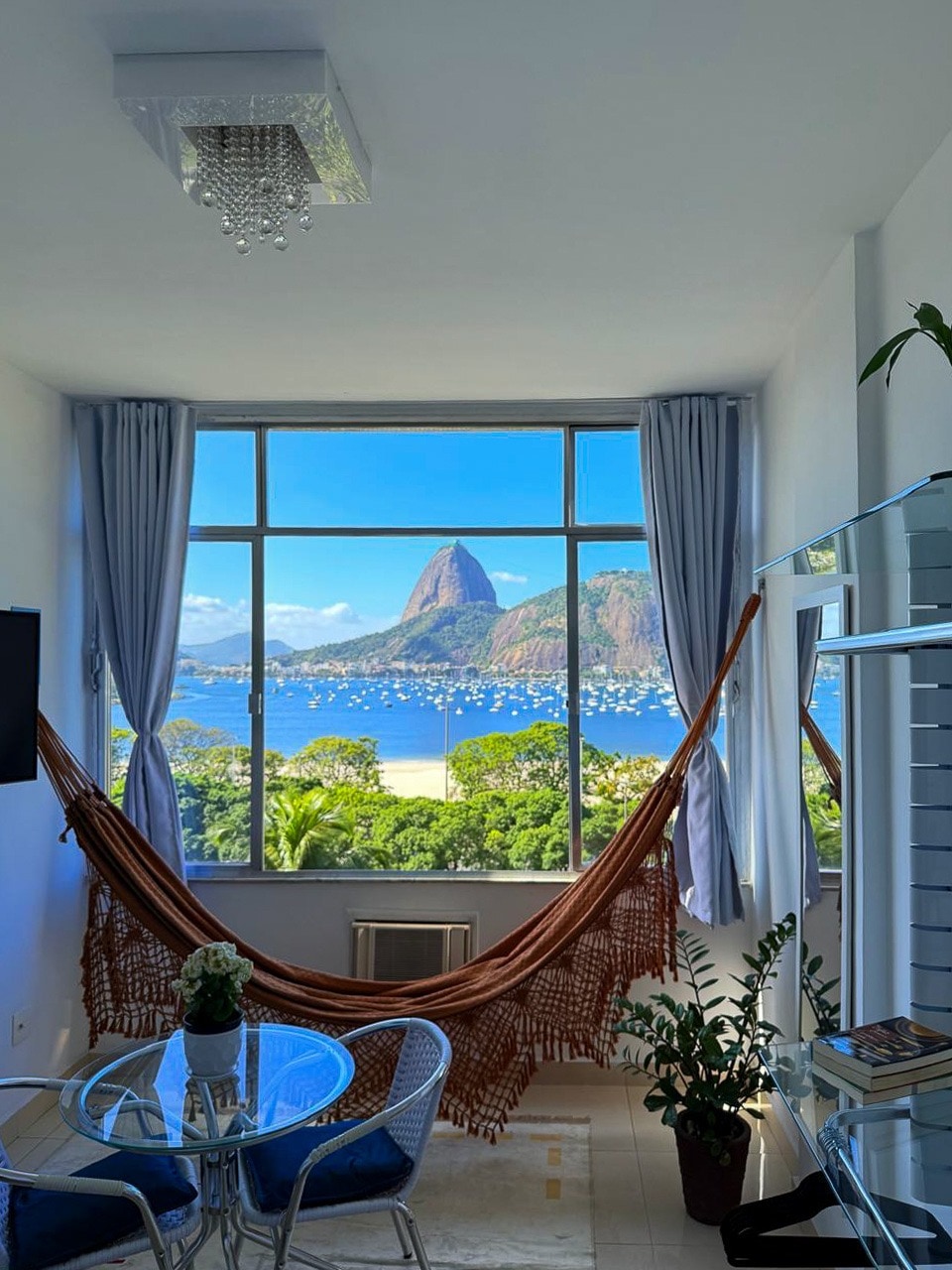 Vista espetacular da enseada de Botafogo com Pão de Açúcar. Apartamento com saleta equipada com geladeira, eletrodomésticos, utensílios de cozinha e ventilador de teto; copa; banheiro; quarto com ar condicionado, ventilador de teto, televisão Smart e Wi-Fi. A 3 minutos a pé do shopping e 7 minutos do metrô, entre Copacabana e o centro histórico e financeiro da cidade do Rio. Prédio com câmeras de segurança e portaria 24 h. Próximo a estacionamento pago 24h, comércio, serviços e centro cultural.