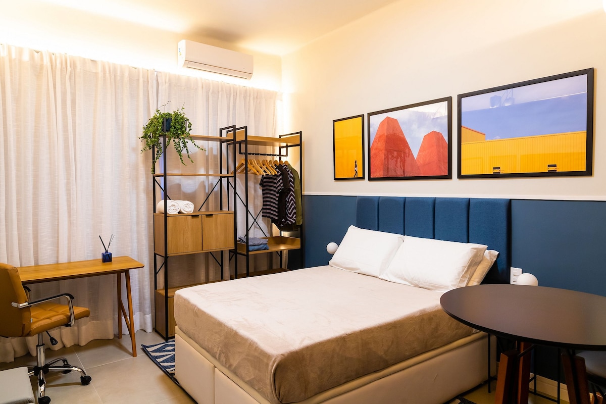 Clean cut studio with a queen size double bed. The airbnb has a breathtaking front view to Guanabara Bay and the Sugar Loaf. See the sunrise in the most incredible view of Rio de Janeiro. There is desk for home office, window unit air-conditioner, smart TV, fridge with freezer. Two ring gas stove and the apartment has a water filter and ceiling fans on both living and bedroom. Warm shower. 5min walk from metro station.