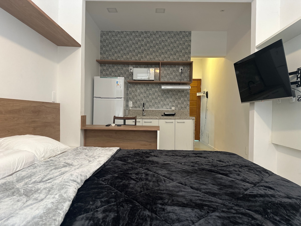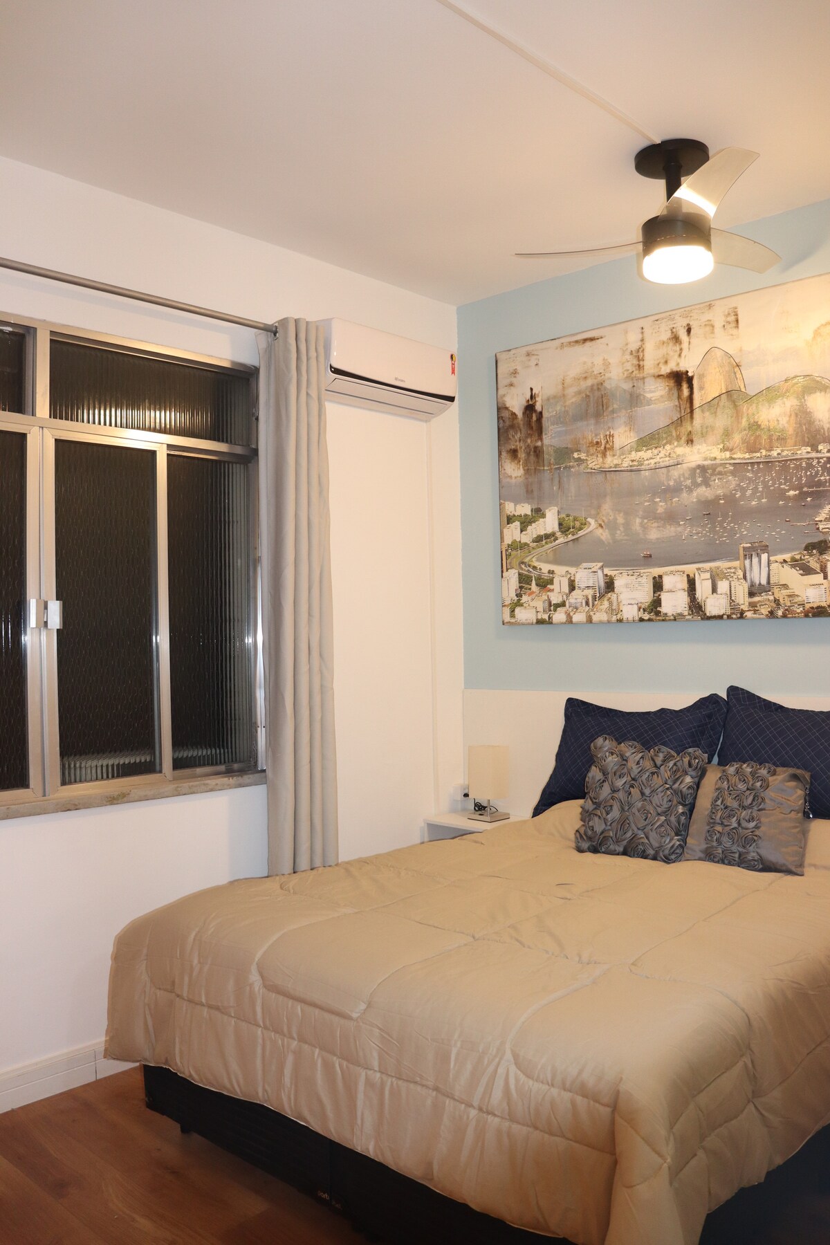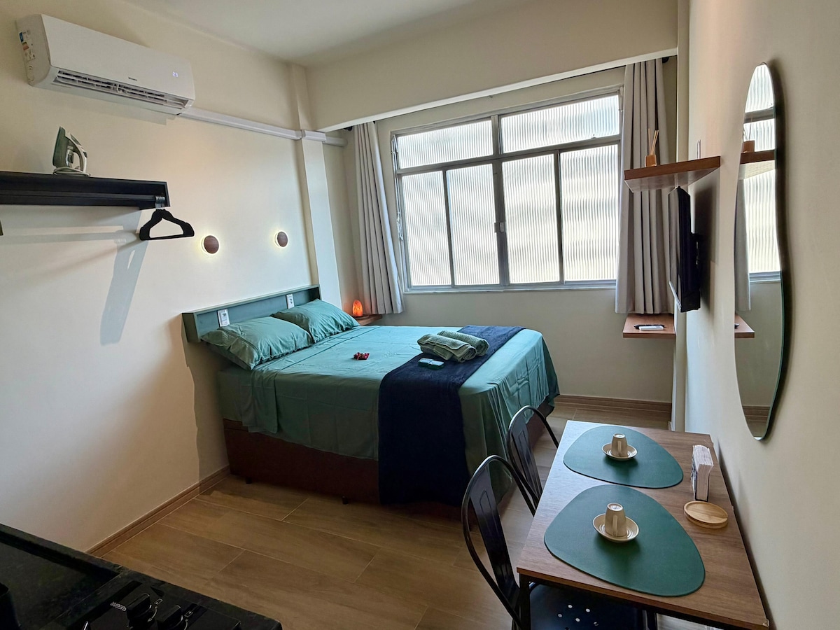Clean cut studio with a queen size double bed. The airbnb has a breathtaking front view to Guanabara Bay and the Sugar Loaf. See the sunrise in the most incredible view of Rio de Janeiro. There is desk for home office, window unit air-conditioner, smart TV, fridge with freezer. Two ring gas stove and the apartment has a water filter and ceiling fans on both living and bedroom. Warm shower. 5min walk from metro station.