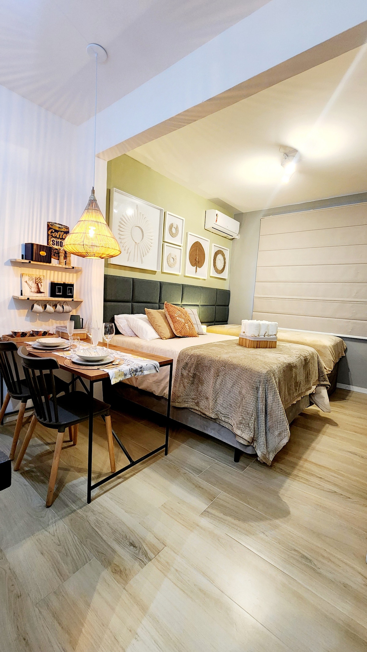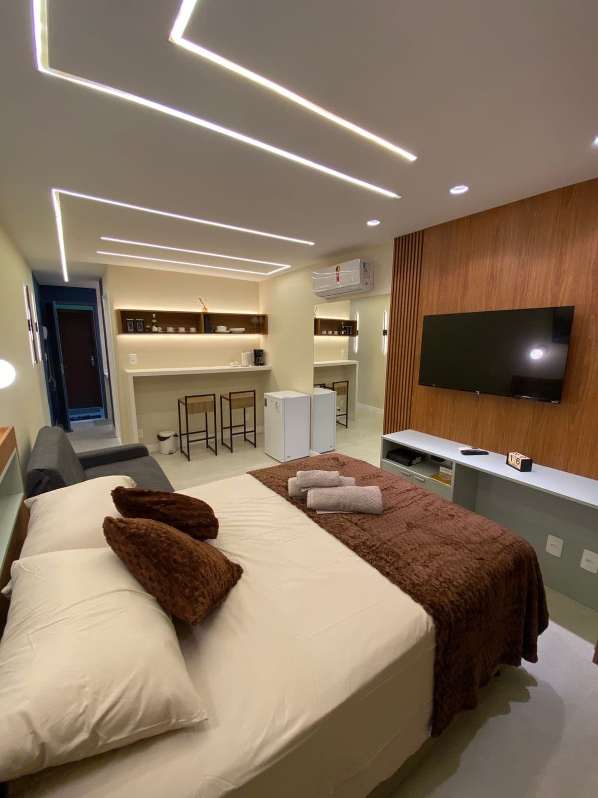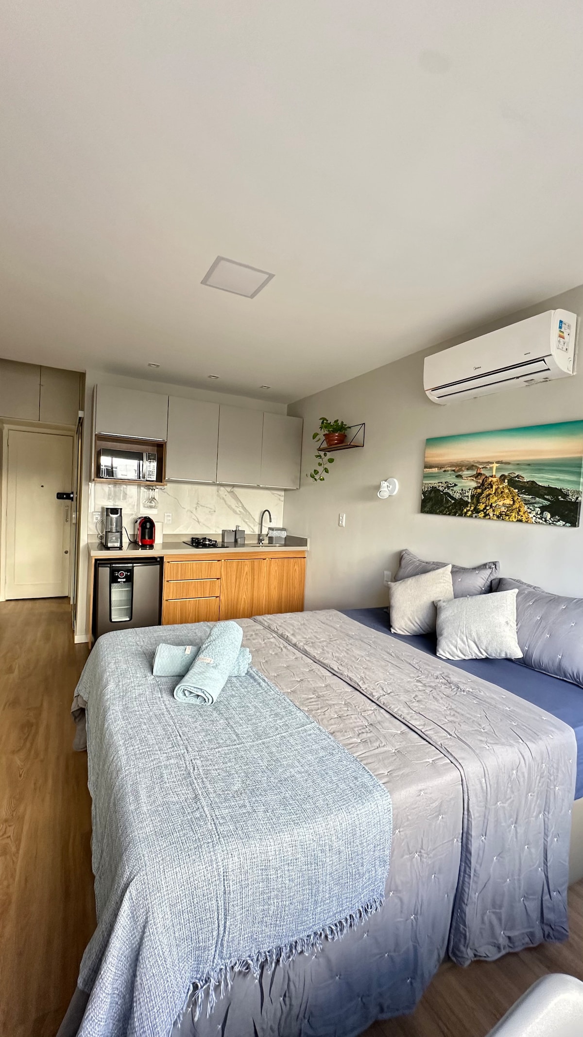 Clean cut studio with a queen size double bed. The airbnb has a breathtaking front view to Guanabara Bay and the Sugar Loaf. See the sunrise in the most incredible view of Rio de Janeiro. There is desk for home office, window unit air-conditioner, smart TV, fridge with freezer. Two ring gas stove and the apartment has a water filter and ceiling fans on both living and bedroom. Warm shower. 5min walk from metro station.