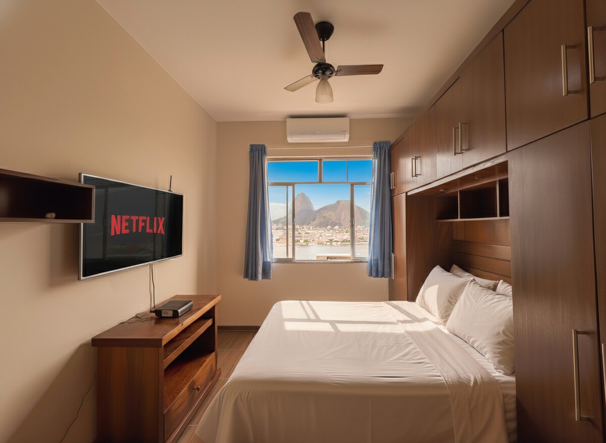 O apartamento foi todo reformado. Conta com portaria 24 horas, com uma vista de tirar o fôlego. O apartamento possui janelas acústicas, ar condicionado split em todos os ambientes, máquina de lavar e secar, geladeira, cooktop, forno e micro-ondas. A cozinha possui todos os utensílios necessários para preparar sua refeição ideal. Fornecemos roupa de cama e banho para todos os hospedes. Tv a cabo e Wi-Fi de 350MB.