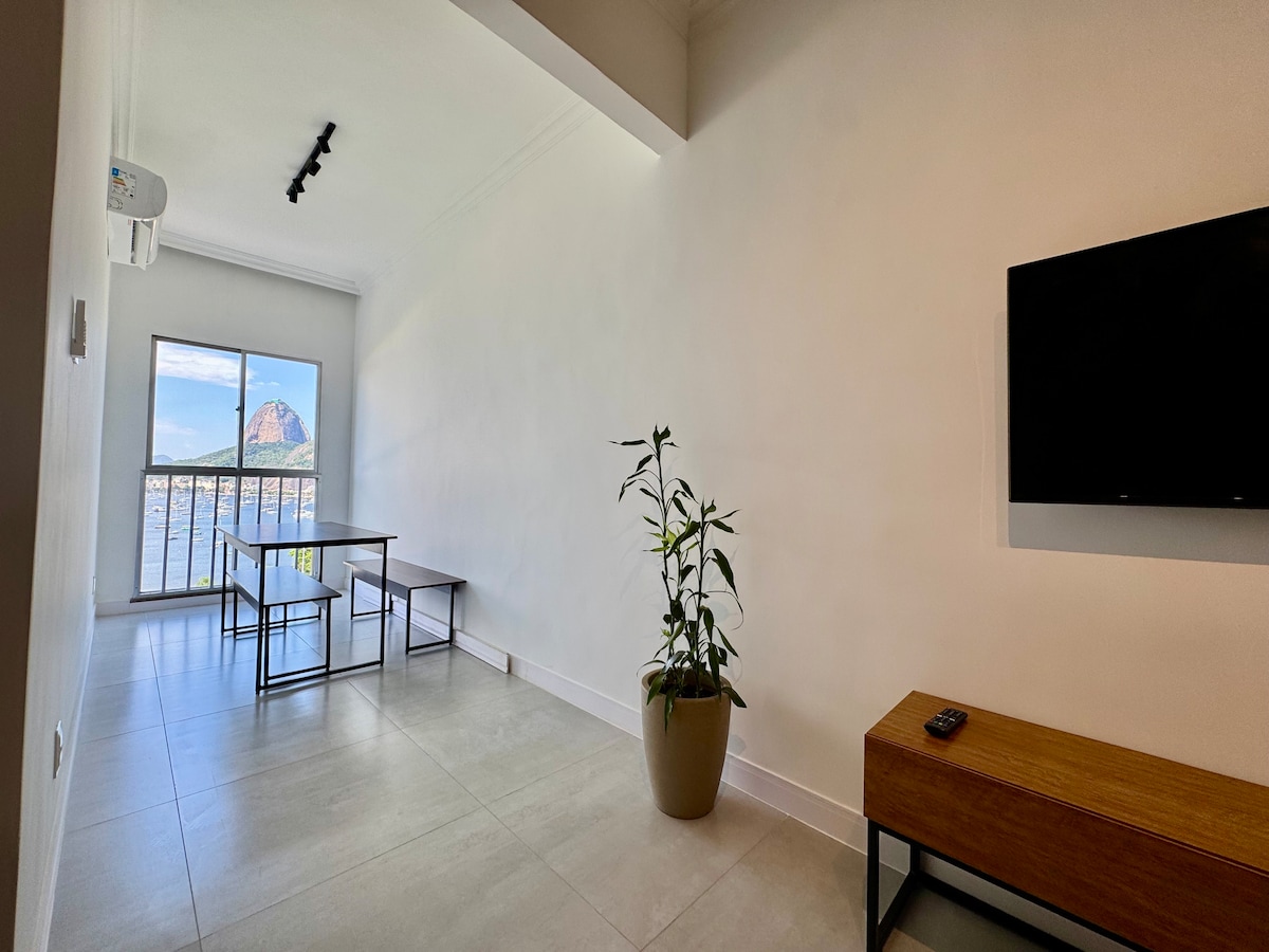 Studio todo reformado com vista privilegiada para a Praia de Botafogo e o cartão postal do Rio de Janeiro- montanha do Pão de Açúcar. Em andar alto e com janela antirruído, ambiente perfeito para passar dias incríveis na melhor localização do Rio de Janeiro! Mercado e cinema no mesmo quarteirão! Ambiente familiar com restrição de entrada de pessoas por dia - fora cadastrados! Câmera e controle no edifício!