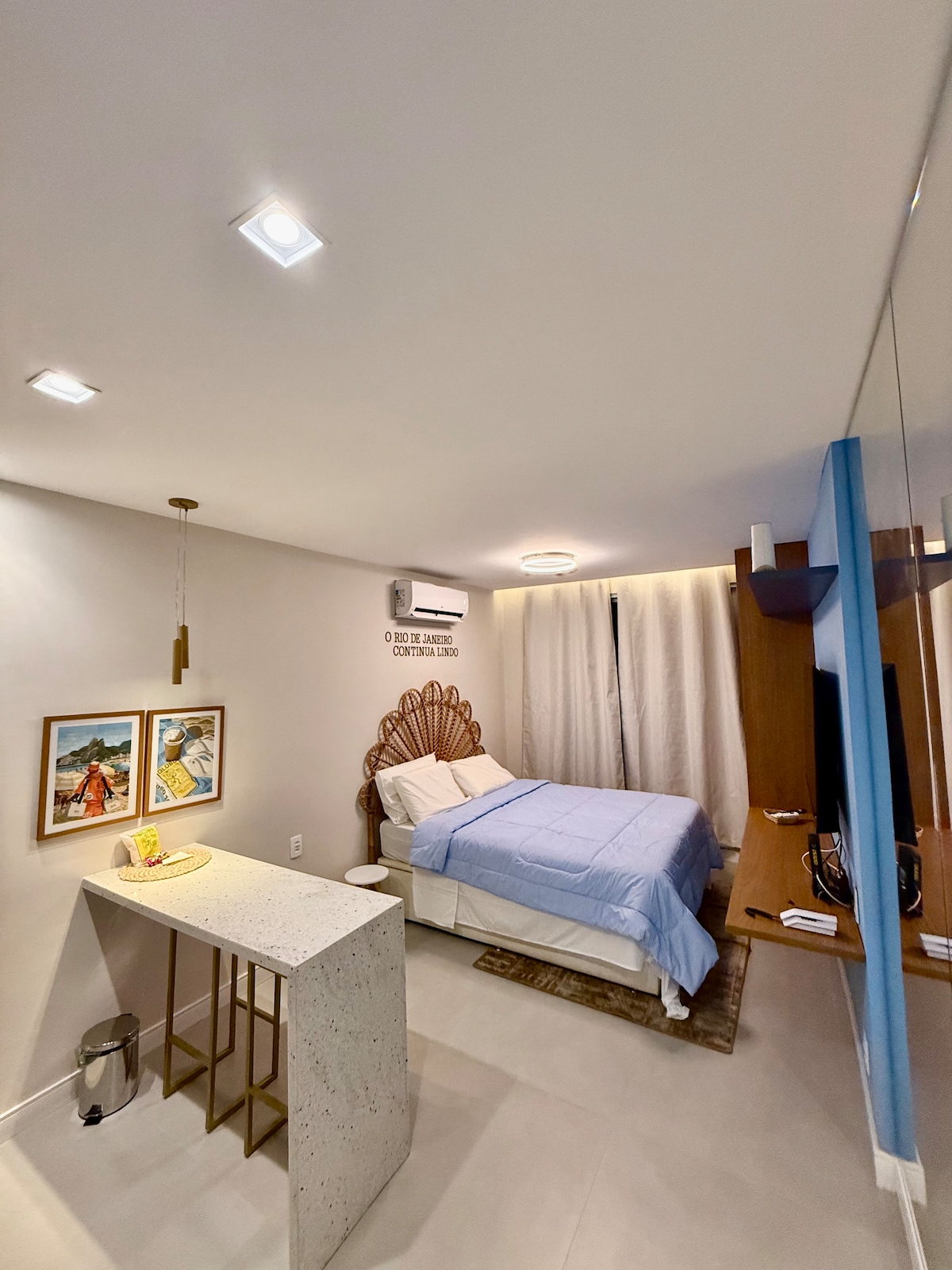 Clean cut studio with a queen size double bed. The airbnb has a breathtaking front view to Guanabara Bay and the Sugar Loaf. See the sunrise in the most incredible view of Rio de Janeiro. There is desk for home office, window unit air-conditioner, smart TV, fridge with freezer. Two ring gas stove and the apartment has a water filter and ceiling fans on both living and bedroom. Warm shower. 5min walk from metro station.